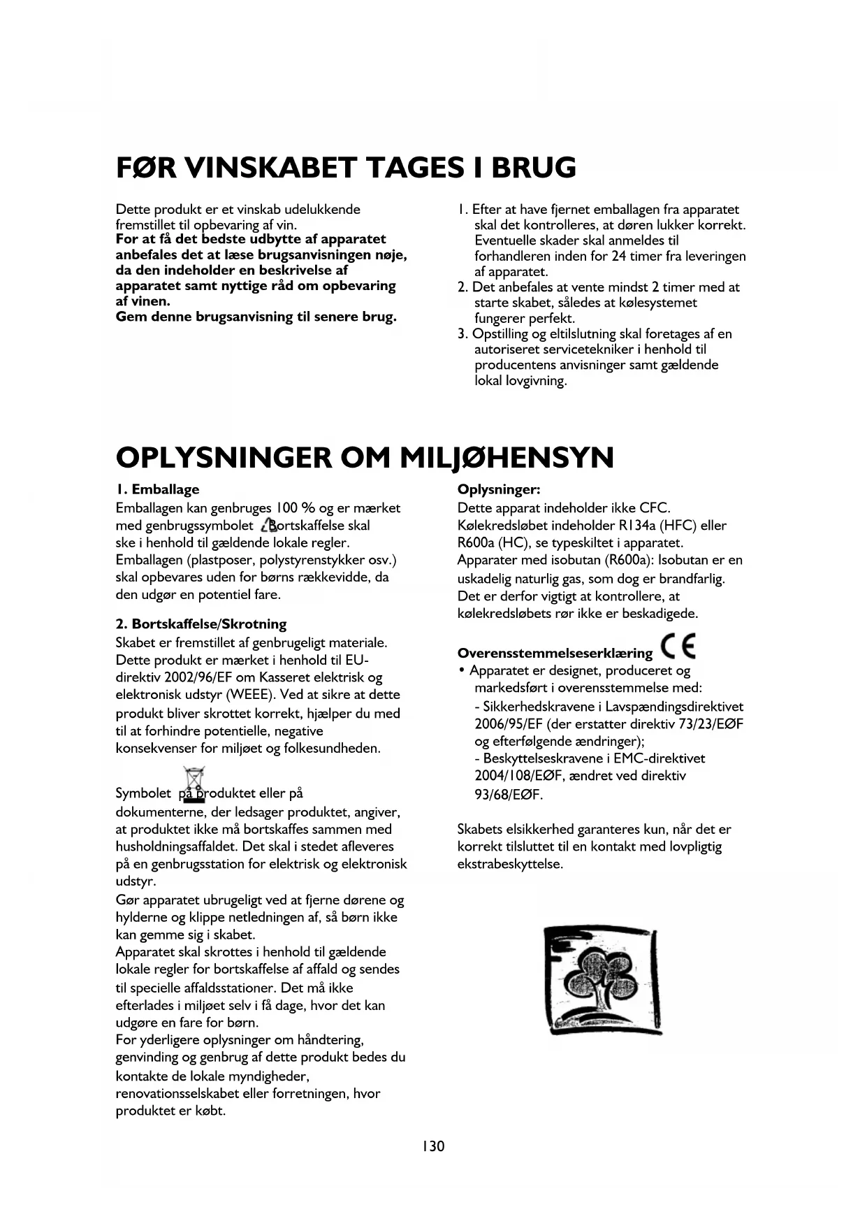 Skabet er fremstillet af genbrugeligt materiale. Dette produkt er mærket i henhold til EU- direktiv 2002/96/EF om Kasseret elektrisk og elektronisk udstyr (WEEE). Ved at sikre at dette produkt bliver skrottet korrekt, hjælper du med til at forhindre potentielle, negative konsekvenser for miljøet og folkesundheden. Symbolet på produktet eller på dokumenterne, der ledsager produktet, angiver, at produktet ikke må bortskaffes sammen med husholdningsaffaldet. Det skal i stedet afleveres på en genbrugsstation for elektrisk og elektronisk udstyr. Gør apparatet ubrugeligt ved at fjerne dørene og hylderne og klippe netledningen af, så børn ikke kan gemme sig i skabet. Apparatet skal skrottes i henhold til gældende lokale regler for bortskaffelse af affald og sendes til specielle affaldsstationer. Det må ikke efterlades i miljøet selv i få dage, hvor det kan udgøre en fare for børn. For yderligere oplysninger om håndtering, genvinding og genbrug af dette produkt bedes du kontakte de lokale myndigheder, renovationsselskabet eller forretningen, hvor produktet er købt. Oplysninger: Dette apparat indeholder ikke CFC. Kølekredsløbet indeholder R134a (HFC) eller R600a (HC), se typeskiltet i apparatet. Apparater med isobutan (R600a): Isobutan er en uskadelig naturlig gas, som dog er brandfarlig. Det er derfor vigtigt at kontrollere, at kølekredsløbets rør ikke er beskadigede. Overensstemmelseserklæring