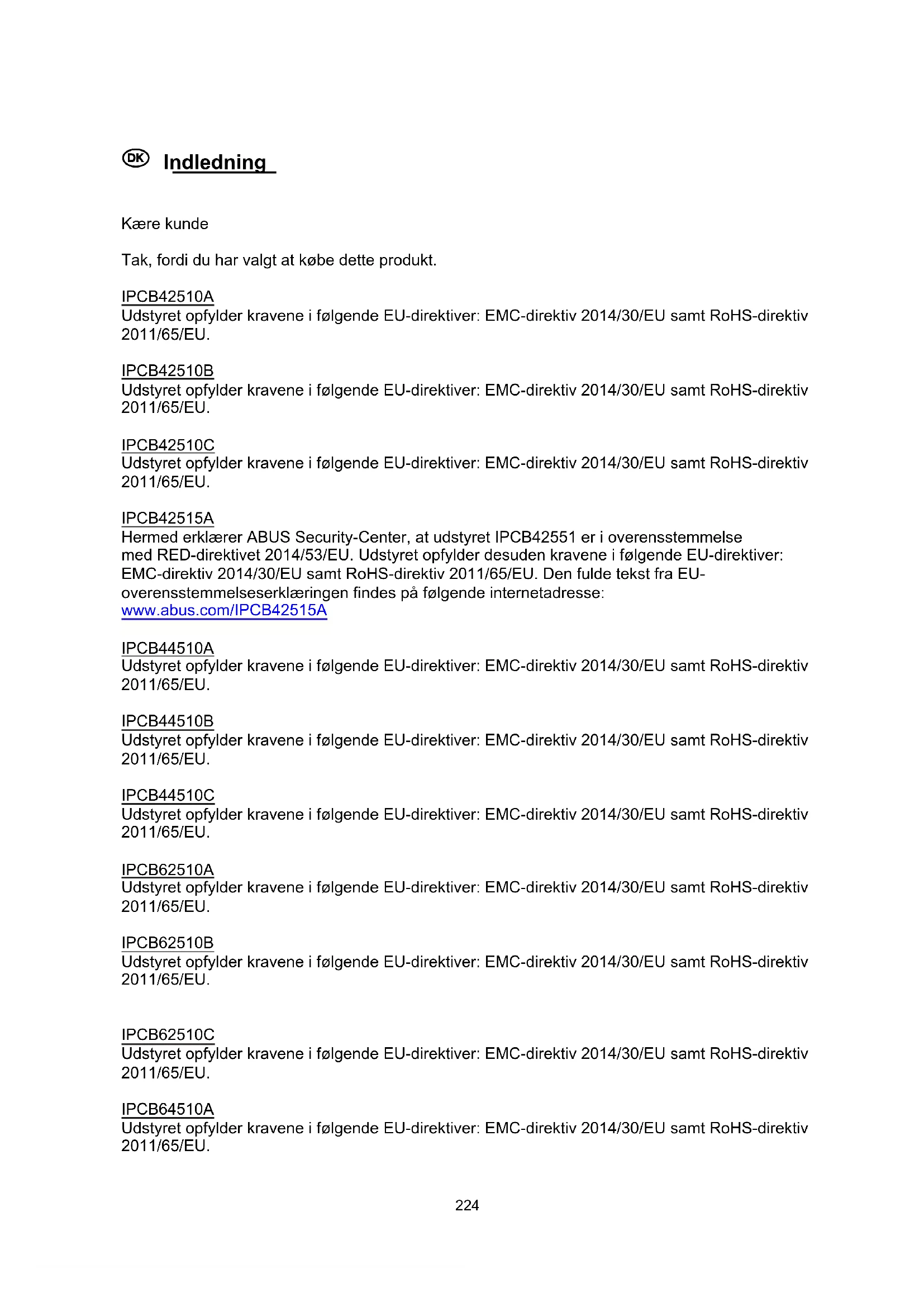 Kære kunde Tak, fordi du har valgt at købe dette produkt. IPCB42510A Udstyret opfylder kravene i følgende EU-direktiver: EMC-direktiv 2014/30/EU samt RoHS-direktiv 2011/65/EU. IPCB42510B Udstyret opfylder kravene i følgende EU-direktiver: EMC-direktiv 2014/30/EU samt RoHS-direktiv 2011/65/EU. IPCB42510C Udstyret opfylder kravene i følgende EU-direktiver: EMC-direktiv 2014/30/EU samt RoHS-direktiv 2011/65/EU. IPCB42515A Hermed erklærer ABUS Security-Center, at udstyret IPCB42551 er i overensstemmelse med RED-direktivet 2014/53/EU. Udstyret opfylder desuden kravene i følgende EU-direktiver: EMC-direktiv 2014/30/EU samt RoHS-direktiv 2011/65/EU. Den fulde tekst fra EU- overensstemmelseserklæringen findes på følgende internetadresse: www.abus.com/IPCB42515A IPCB44510A Udstyret opfylder kravene i følgende EU-direktiver: EMC-direktiv 2014/30/EU samt RoHS-direktiv 2011/65/EU. IPCB44510B Udstyret opfylder kravene i følgende EU-direktiver: EMC-direktiv 2014/30/EU samt RoHS-direktiv 2011/65/EU. IPCB44510C Udstyret opfylder kravene i følgende EU-direktiver: EMC-direktiv 2014/30/EU samt RoHS-direktiv 2011/65/EU. IPCB62510A Udstyret opfylder kravene i følgende EU-direktiver: EMC-direktiv 2014/30/EU samt RoHS-direktiv 2011/65/EU. IPCB62510B Udstyret opfylder kravene i følgende EU-direktiver: EMC-direktiv 2014/30/EU samt RoHS-direktiv 2011/65/EU.