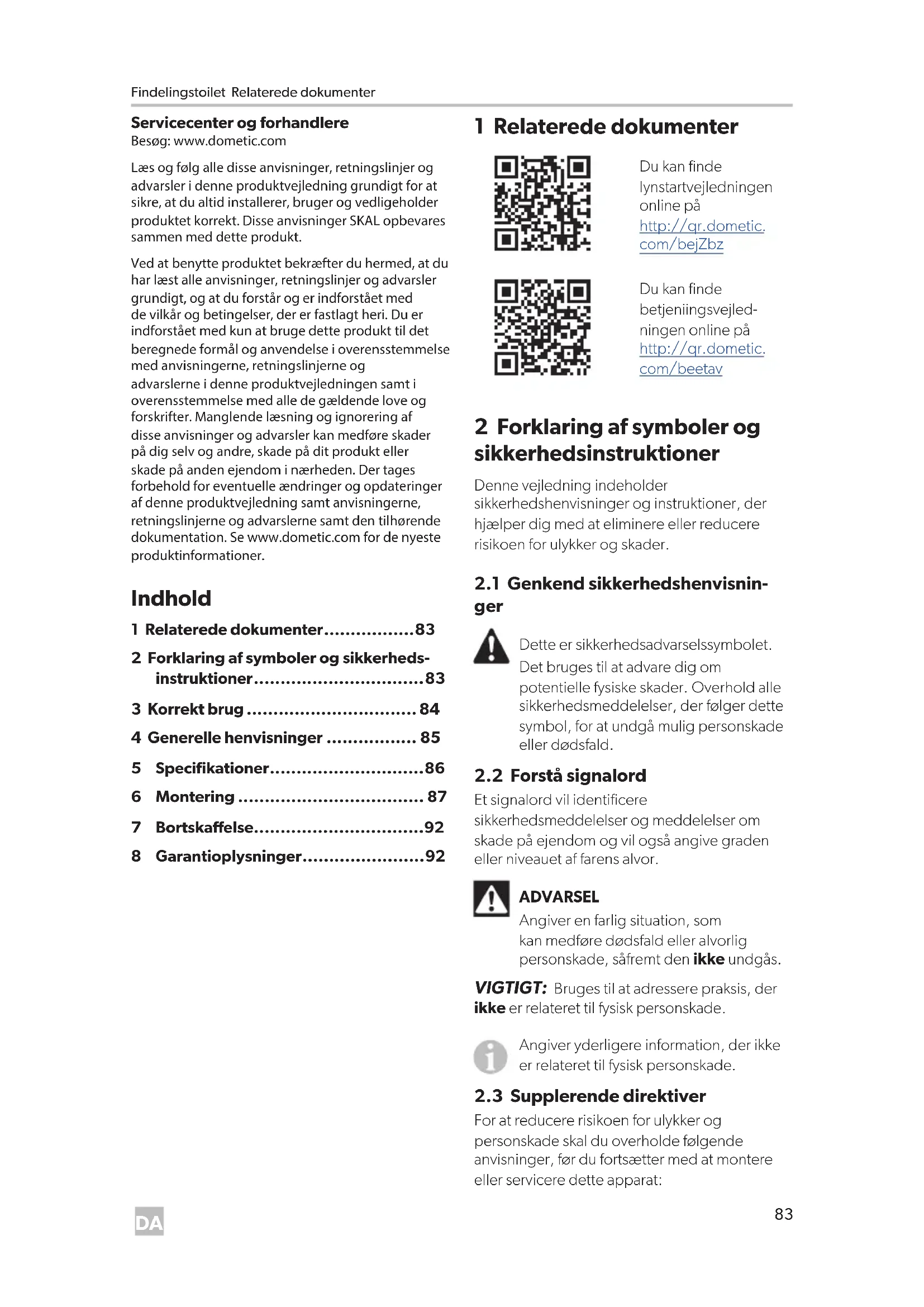 For at reducere risikoen for ulykker og personskade skal du overholde følgende anvisninger, før du fortsætter med at montere eller servicere dette apparat: Servicecenter og forhandlere Besøg: www.dometic.com Læs og følg alle disse anvisninger, retningslinjer og advarsler i denne produktvejledning grundigt for at sikre, at du altid installerer, bruger og vedligeholder produktet korrekt. Disse anvisninger SKAL opbevares sammen med dette produkt. Ved at benytte produktet bekræfter du hermed, at du har læst alle anvisninger, retningslinjer og advarsler grundigt, og at du forstår og er indforstået med de vilkår og betingelser, der er fastlagt heri. Du er indforstået med kun at bruge dette produkt til det beregnede formål og anvendelse i overensstemmelse med anvisningerne, retningslinjerne og advarslerne i denne produktvejledningen samt i overensstemmelse med alle de gældende love og forskrifter. Manglende læsning og ignorering af disse anvisninger og advarsler kan medføre skader på dig selv og andre, skade på dit produkt eller skade på anden ejendom i nærheden. Der tages forbehold for eventuelle ændringer og opdateringer af denne produktvejledning samt anvisningerne, retningslinjerne og advarslerne samt den tilhørende dokumentation. Se www.dometic.com for de nyeste produktinformationer. IndholdKorrekt brug Findelingstoilet