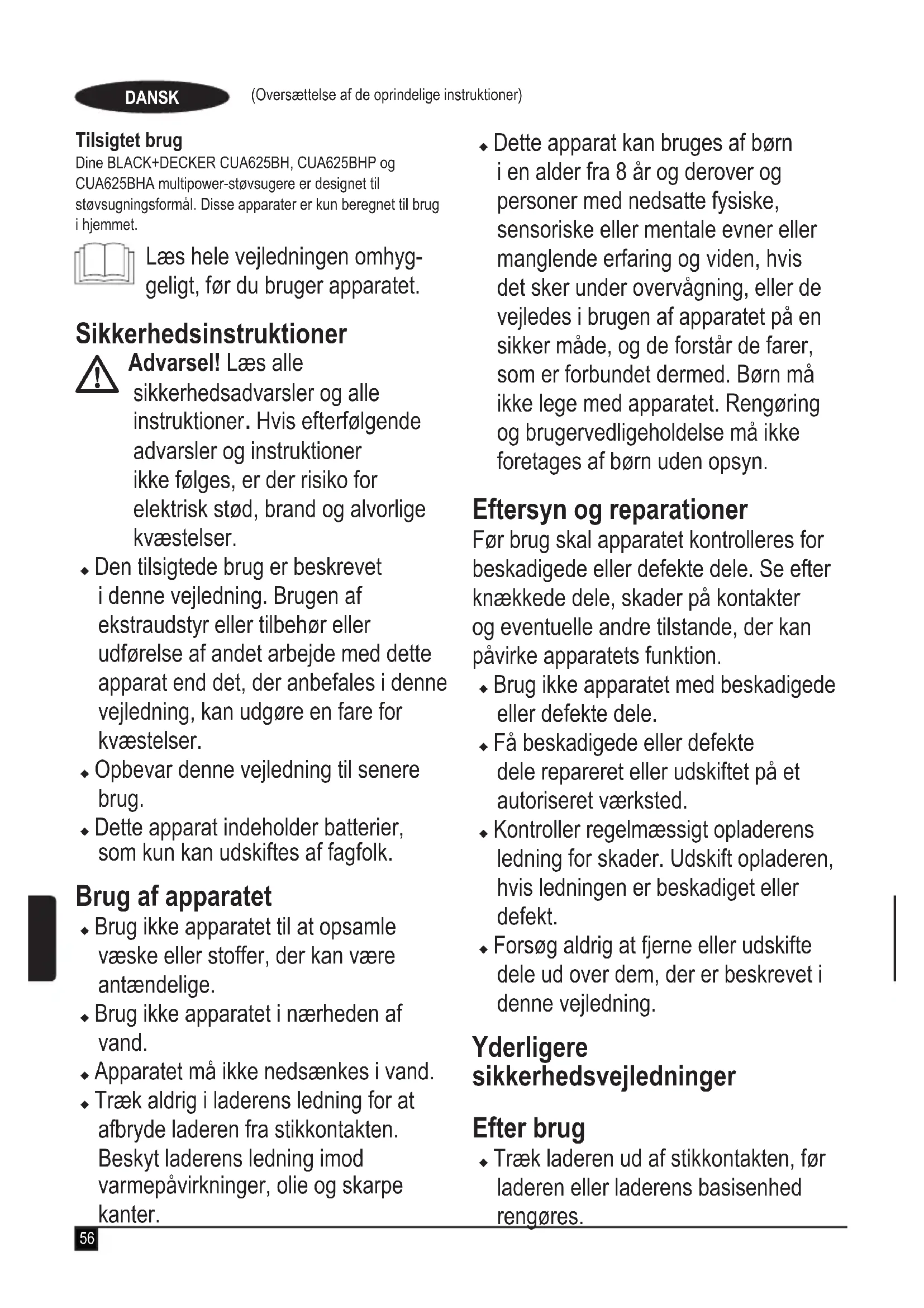 Særskilt bortskaffelse. Produkter og batterier mær- ket med dette symbol må ikke bortskaffes sammen med normalt husholdningsaffald. Produkter og batterier indeholder materialer, der kan genvindes eller genbruges og således reducere efterspørgslen efter råvarer. Genbrug venligst elektriske produkter og batterier i henhold til lokale bestemmelser. Yderligere informationer findes på www.2helpU.com Tekniske data CUA625BH CUA625BHP CUA625BHASpænding V 21.6 21.6 21.6Watt timer Wt 54 54 54Vægt kg 4.35 4.35 4.35 Garanti Black & Decker er overbevist om den gode kvalitet af sine produkter og giver forbrugerne en garanti på 24 måneder fra købsdatoen. Garantien er et tillæg til forbrugerens lovmæssige rettigheder og påvirker ikke disse. Garantien er gyldig inden for medlemsstaterne af Den Europæiske Union og Det Europæiske Frihandelsområde. Når du gør krav på garantien, skal kravet være i overensstemmelse med Black & Decker vilkår og betingelser, og du skal indsende dokumentation for købet til sælgeren eller til en autoriseret reparatør. Vilkår og betingelser for Black & Decker 2 års garanti og placeringen af dit nærmeste autoriserede serviceværksted kan fås på internettet på www.2helpU.com, eller ved at kontakte dit lokale Black & Decker kontor på den adresse, der er angivet i denne vejledning. Besøg venligst vores websted www.blackanddecker.co.uk for at registrere dit nye Black & Decker-produkt og modtage opdateringer om nye produkter og specielle tilbud.61 (Alkuperäisten ohjeiden käännös)SUOMI Käyttötarkoitus Monitehoiset BLACK+DECKER CUA625BH, CUA625BHP ja CUA625BHA -pölynimurit on tarkoitettu imuroimiseen. Laitteet on tarkoitettu ainoastaan kotitalouskäyttöön. Lue nämä ohjeet huolellisesti ennen laitteen käyttöä. Turvallisuusohjeet