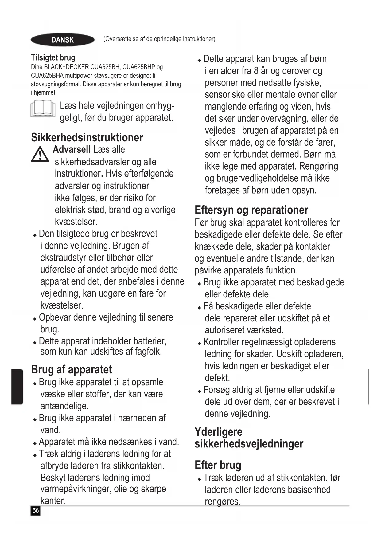 Særskilt bortskaffelse. Produkter og batterier mær- ket med dette symbol må ikke bortskaffes sammen med normalt husholdningsaffald. Produkter og batterier indeholder materialer, der kan genvindes eller genbruges og således reducere efterspørgslen efter råvarer. Genbrug venligst elektriske produkter og batterier i henhold til lokale bestemmelser. Yderligere informationer findes på www.2helpU.com Tekniske data CUA625BH CUA625BHP CUA625BHASpænding V 21.6 21.6 21.6Watt timer Wt 54 54 54Vægt kg 4.35 4.35 4.35 Garanti Black & Decker er overbevist om den gode kvalitet af sine produkter og giver forbrugerne en garanti på 24 måneder fra købsdatoen. Garantien er et tillæg til forbrugerens lovmæssige rettigheder og påvirker ikke disse. Garantien er gyldig inden for medlemsstaterne af Den Europæiske Union og Det Europæiske Frihandelsområde. Når du gør krav på garantien, skal kravet være i overensstemmelse med Black & Decker vilkår og betingelser, og du skal indsende dokumentation for købet til sælgeren eller til en autoriseret reparatør. Vilkår og betingelser for Black & Decker 2 års garanti og placeringen af dit nærmeste autoriserede serviceværksted kan fås på internettet på www.2helpU.com, eller ved at kontakte dit lokale Black & Decker kontor på den adresse, der er angivet i denne vejledning. Besøg venligst vores websted www.blackanddecker.co.uk for at registrere dit nye Black & Decker-produkt og modtage opdateringer om nye produkter og specielle tilbud.61 (Alkuperäisten ohjeiden käännös)SUOMI Käyttötarkoitus Monitehoiset BLACK+DECKER CUA625BH, CUA625BHP ja CUA625BHA -pölynimurit on tarkoitettu imuroimiseen. Laitteet on tarkoitettu ainoastaan kotitalouskäyttöön. Lue nämä ohjeet huolellisesti ennen laitteen käyttöä. Turvallisuusohjeet