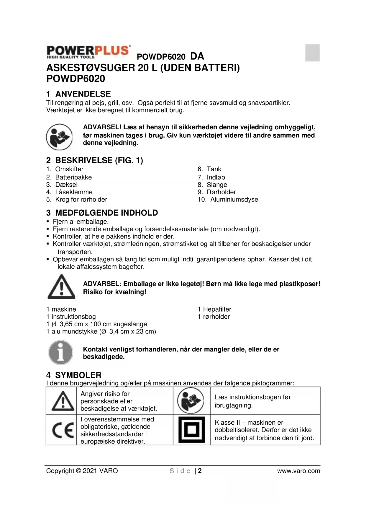 - Det samlede værktøj skal returneres til forhandleren i rimelig ren stand, i den originale blæseformede æske (hvis relevant for enheden) sammen med købsdokumentation. 15 MILJØ Hvis maskinen skal skiftes ud efter lang tids brug, må den ikke bortskaffes som husholdningsaffald, men skal bortskaffes på en miljømæssigt forsvarlig måde. Affald produceret af de elektriske maskiner må ikke behandles som normalt husaffald. Sørg for at genbruge det, hvor der findes egnede anlæg til det. Kontakt den lokale instans eller forhandleren for at få rådgivning om indsamling og bortskaffelse.POWDP6020 DA Copyright © 2021 VARO S i d e | 9 www.varo.com 16 KONFORMITETSERKLÆRING VARO – Vic. Van Rompuy N.V – Joseph Van Instraat 9 – BE2500 Lier – Belgien, erklærer hermed, at Apparatbeskrivelse: Askestøvsuger Varemærke: PowerPlus Varenummer: POWDP6020 er i overensstemmelse med de væsentlige krav og andre relevante bestemmelser i gældende europæiske direktiver, der er baseret på anvendelse af europæiske harmoniserede standarder. Enhver uautoriseret modifikation af apparatet ugyldiggør denne erklæring. EU-direktiver (herunder eventuelle tillæg frem til datoen for undertegnelsen): 2011/65/EU 2014/30/EU Harmoniserede europæiske standarder (herunder eventuelle tillæg frem til datoen for undertegnelsen): EN60335-1 : 2012 EN60335-2-2: 2010 EN55014-1 : 2017 EN55014-2 : 2015 Indehaver af den tekniske dokumentation: Philippe Vankerkhove, VARO - Vic. Van Rompuy N.V. Undertegnede handler på vegne af selskabets administrerende direktør,