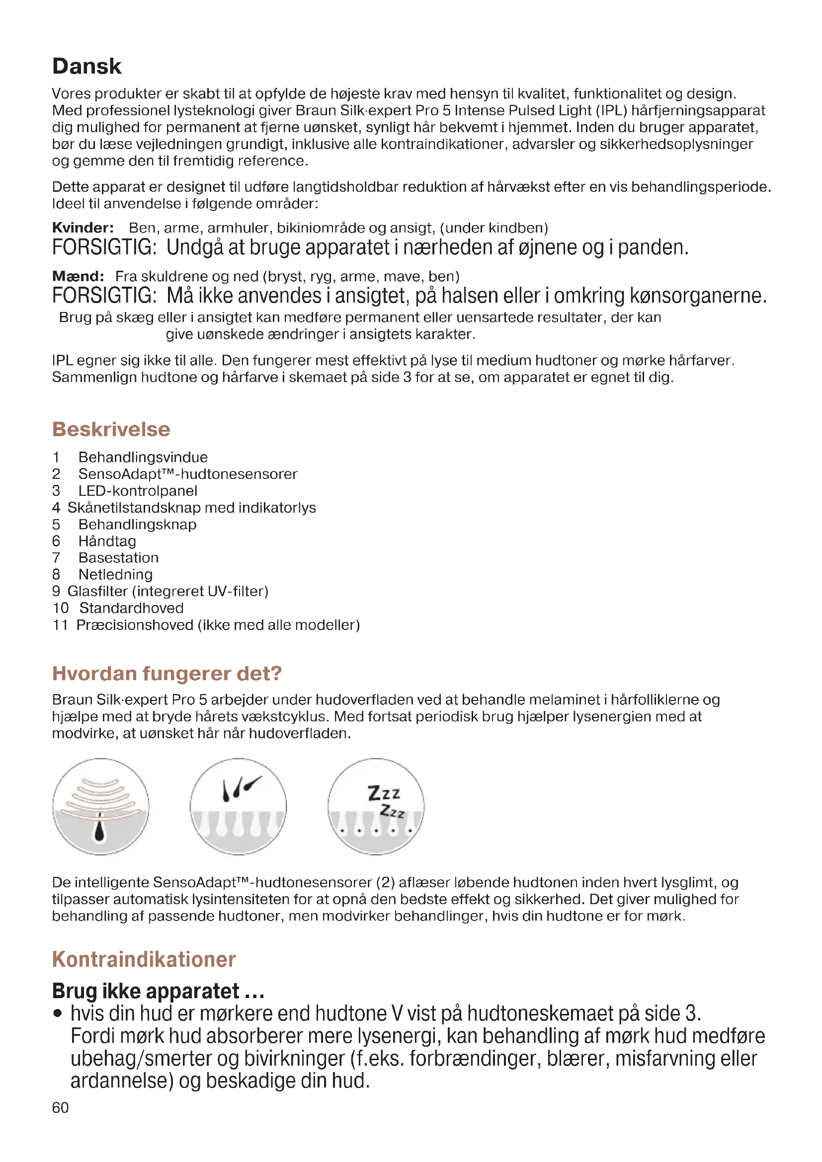 brystvorter, kønsorganer eller omkring anus. Disse områder kan have en mørkere hudtone og/eller tættere hårvækst, og brug af apparatet i disse områder kan medføre ubehag/smerter eller ardannelse på huden.
