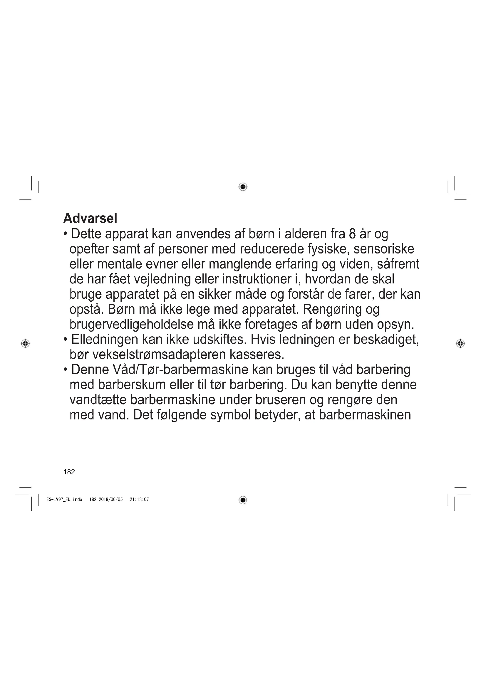 - Dette apparat kan anvendes af børn i alderen fra 8 år og opefter samt af personer med reducerede fysiske, sensoriske eller mentale evner eller manglende erfaring og viden, såfremt de har fået vejledning eller instruktioner i, hvordan de skal bruge apparatet på en sikker måde og forstår de farer, der kan opstå. Børn må ikke lege med apparatet. Rengøring og brugervedligeholdelse må ikke foretages af børn uden opsyn.
