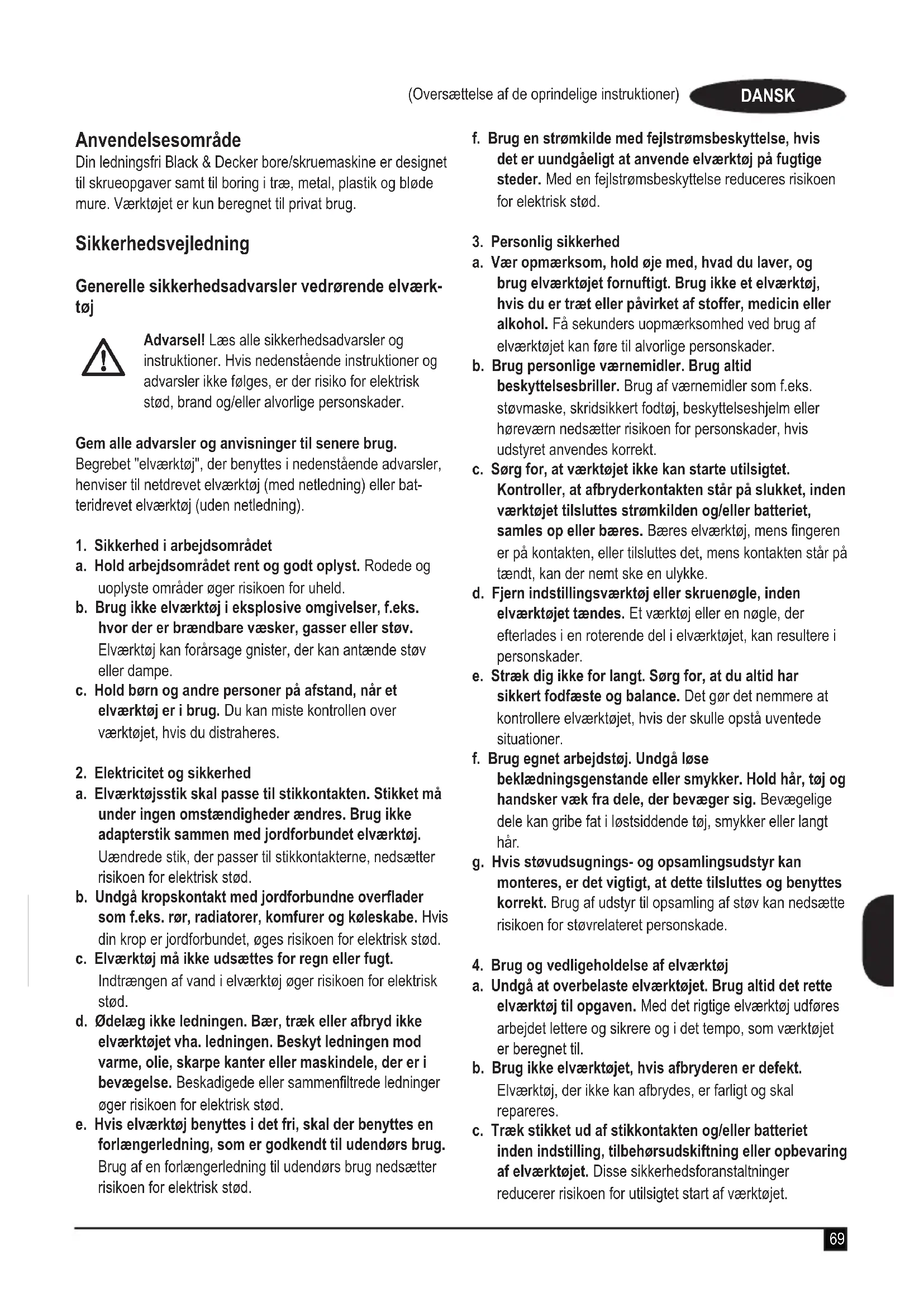 Kevin Hewitt Vice-President Global Engineering Black & Decker Europe, 210 Bath Road, Slough, Berkshire, SL1 3YD Storbritannien 20/01/2014 13/25 16/2875 (Oversættelse af de oprindelige instruktioner) DANSK Garanti Black & Decker garanterer, at produktet er fri for skader og fejl og tilbyder en fremragende garanti. Garantien er et tillæg til forbrugerens lovsikrede rettigheder og påvirker ikke disse. Ga- rantien gælder inden for medlemsstaterne af den Europæiske Union og i det Europæiske Frihandelsområde. Hvis et Black & Decker-produkt går i stykker på grund af materiel skade og/eller fabrikationsfejl eller på anden måde ikke fungerer i overensstemmelse med specikationen inden for 24 måneder fra købsdatoen, påtager Black & Decker sig at reparere eller ombytte produktet med mindst mulig ulempe for kunden. Garantien gælder ikke for fejl og mangler, der er sket i forbindelse med: u Produktet har været anvendt erhvervsmæssigt eller til udlejning. u Produktet har været anvendt forkert eller er ikke vedlige- holdt. u Produktet er beskadiget af fremmedlegemer, substanser eller pga. uheld. u Garantien gælder ikke, hvis reparationer er udført af andre end et autoriseret Black & Decker-værksted. For at udnytte garantien skal produktet og købskvitteringen indleveres til forhandleren eller til et autoriseret værksted. Kontakt det lokale Black & Decker-kontor på den adresse, der er opgivet i denne vejledning, for at få oplysninger om nærmeste autoriserede værksted. En liste over alle autoris- erede Black & Decker-serviceværksteder samt servicevilkår og kontaktpersoner er tilgængelig på internettet på adressen: www.2helpU.com Gå venligst ind på vores websted www.blackanddecker.dk for at registrere dit nye Black & Decker-produkt og for at blive holdt ajour om nye produkter og specialtilbud. Der ndes yderligere oplysninger om mærket Black & Decker og vores produktsortiment på adressen www.blackanddecker.dk76 (Alkuperäisten ohjeiden käännös) SUOMI Käyttötarkoitus Tämä Black & Deckerin pora/ruuvinväännin on tarkoitettu ruuvien kiinnittämiseen sekä puun, metallin, muovin ja peh- meän betonin poraamiseen. Tämä työkalu on tarkoitettu vain yksityiskäyttöön. Turvallisuusohjeet Sähkötyökalujen yleiset turvavaroitukset