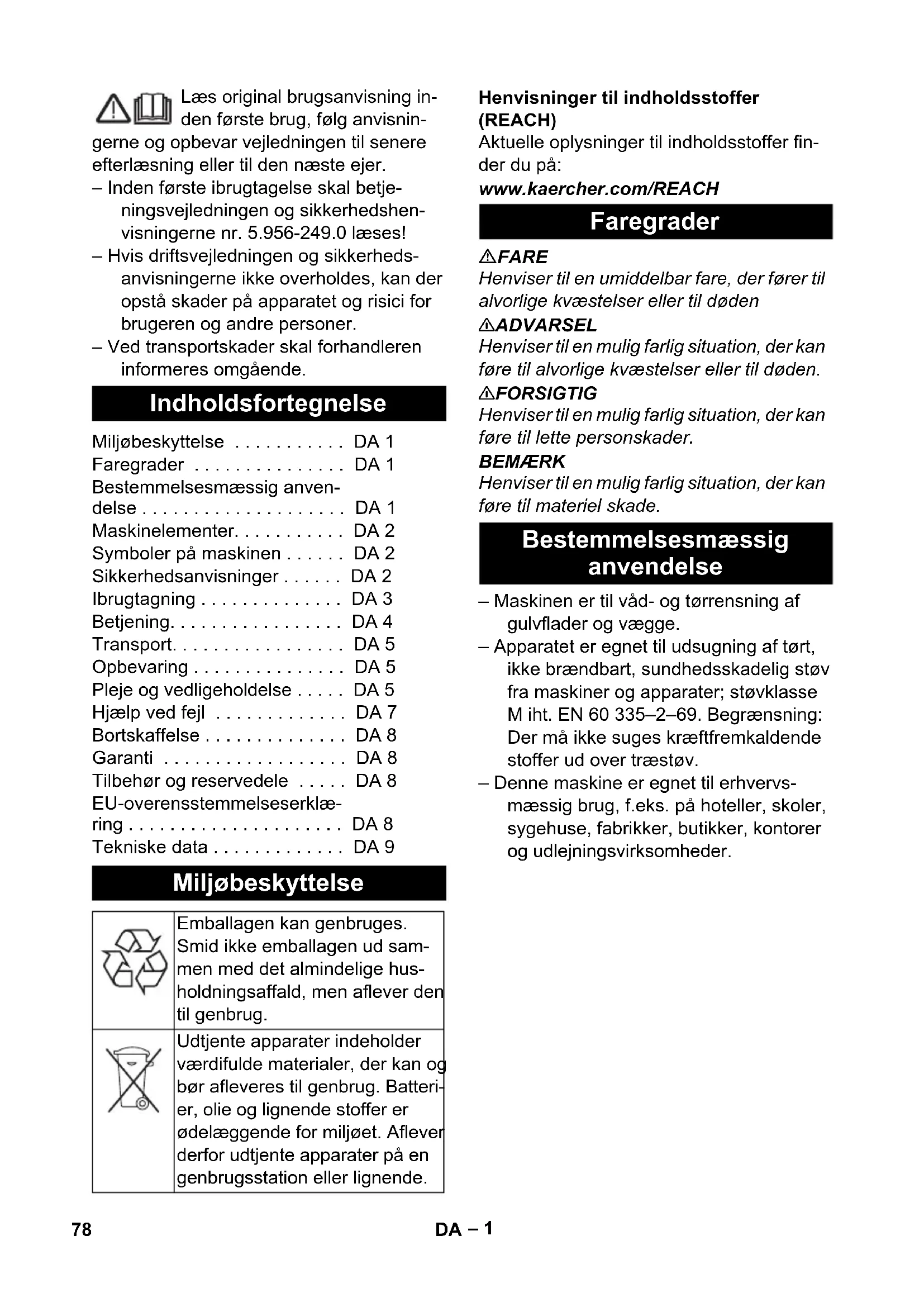Refª Comprimen- to do cabo EU 6.650-665.0 7,5 m GB 6.650-728.0 7,5 m CH 6.650-726.0 7,5 m AU 6.650-727.0 7,5 m 77PT– 1 Læs original brugsanvisning in- den første brug, følg anvisnin- gerne og opbevar vejledningen til senere efterlæsning eller til den næste ejer. – Inden første ibrugtagelse skal betje- ningsvejledningen og sikkerhedshen- visningerne nr. 5.956-249.0 læses! – Hvis driftsvejledningen og sikkerheds- anvisningerne ikke overholdes, kan der opstå skader på apparatet og risici for brugeren og andre personer. – Ved transportskader skal forhandleren informeres omgående. Henvisninger til indholdsstoffer (REACH) Aktuelle oplysninger til indholdsstoffer fin- der du på: www.kaercher.com/REACH FARE Henviser til en umiddelbar fare, der fører til alvorlige kvæstelser eller til døden 몇 ADVARSEL Henviser til en mulig farlig situation, der kan føre til alvorlige kvæstelser eller til døden. 몇 FORSIGTIG Henviser til en mulig farlig situation, der kan føre til lette personskader. BEMÆRK Henviser til en mulig farlig situation, der kan føre til materiel skade. – Maskinen er til våd- og tørrensning af gulvflader og vægge. – Apparatet er egnet til udsugning af tørt, ikke brændbart, sundhedsskadelig støv fra maskiner og apparater; støvklasse M iht. EN 60 335–2–69. Begrænsning: Der må ikke suges kræftfremkaldende stoffer ud over træstøv. – Denne maskine er egnet til erhvervs- mæssig brug, f.eks. på hoteller, skoler, sygehuse, fabrikker, butikker, kontorer og udlejningsvirksomheder. Indholdsfortegnelse Miljøbeskyttelse . . . . . . . . . . . DA 1 Faregrader . . . . . . . . . . . . . . . DA 1 Bestemmelsesmæssig anven- delse . . . . . . . . . . . . . . . . . . . . DA 1 Maskinelementer. . . . . . . . . . . DA 2 Symboler på maskinen . . . . . . DA 2 Sikkerhedsanvisninger . . . . . . DA 2 Ibrugtagning . . . . . . . . . . . . . . DA 3 Betjening. . . . . . . . . . . . . . . . . DA 4 Transport. . . . . . . . . . . . . . . . . DA 5 Opbevaring . . . . . . . . . . . . . . . DA 5 Pleje og vedligeholdelse . . . . . DA 5 Hjælp ved fejl . . . . . . . . . . . . . DA 7 Bortskaffelse . . . . . . . . . . . . . . DA 8 Garanti . . . . . . . . . . . . . . . . . . DA 8 Tilbehør og reservedele . . . . . DA 8 EU-overensstemmelseserklæ- ring . . . . . . . . . . . . . . . . . . . . . DA 8 Tekniske data . . . . . . . . . . . . . DA 9 Miljøbeskyttelse Emballagen kan genbruges. Smid ikke emballagen ud sam- men med det almindelige hus- holdningsaffald, men aflever den til genbrug. Udtjente apparater indeholder værdifulde materialer, der kan og bør afleveres til genbrug. Batteri- er, olie og lignende stoffer er ødelæggende for miljøet. Aflever derfor udtjente apparater på en genbrugsstation eller lignende. Faregrader Bestemmelsesmæssig anvendelse 78 DA– 2 1 Elektroder 2 Sugestuds 3 Sugeslange 4 Slangeholder 5 Lås til skubbebøjlen (kun NT 50/1) 6 Fugedyse 7 Luftudtag, arbejdsluft 8 Sugehoved 9 Sugehovedets låsemekanisme 10 Grebfordybning 11 Snavsbeholder 12 Styringsrulle 13 Håndtag 14 Luftindtag, motor-køleluft 15 Låseprop 16 Gulvmundstykke 17 Sugerør 18 Anslag til værktøjskuffert 19 Gummimuffe, til at skrue 20 Fastgørelsesring 21 Filterdæksel 22 Bæregreb 23 Sugeeffektregulering (trinløs) 24 Værktøjsadapter 25 Skubbebøjle (kun NT 50/1) 26 Drejekontakt til sugeslangens diameter 27 Skala til sugeslangens diameter 28 Drejekontakt med sugeydelsesregulator 29 Stikkontakt 30 Holder til gulvdyse 31 Aftømningsslange (kun NT 50/1) 32 Holder til sugerør 33 Kabelkrog (kun NT 50/1) 34 Bøjet rørstykke 35 Netkabel 36 Holder til bøjet rørstykke (kun NT 30/1, NT 40/1) 37 Filterramme 38 Fladt foldefilter (PES) 39 Rengøring af filter 40 Typeskilt FARE – Hvis returluften føres tilbage i rummet, skal der være en tilstrækkelig høj luft- skifterate L i lokalet. For at overholde de påkrævede grænseværdier, må den til- bageførte volumenstrøm max. udgøre 50 % af friskluftvolumenstrømmen (rumvolumen V