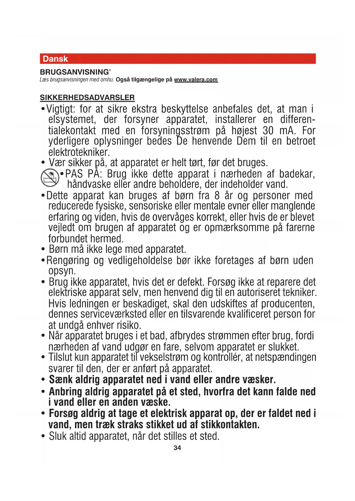 - Forsøg aldrig at tage et elektrisk apparat op, der er faldet ned i vand, men træk straks stikket ud af stikkontakten.