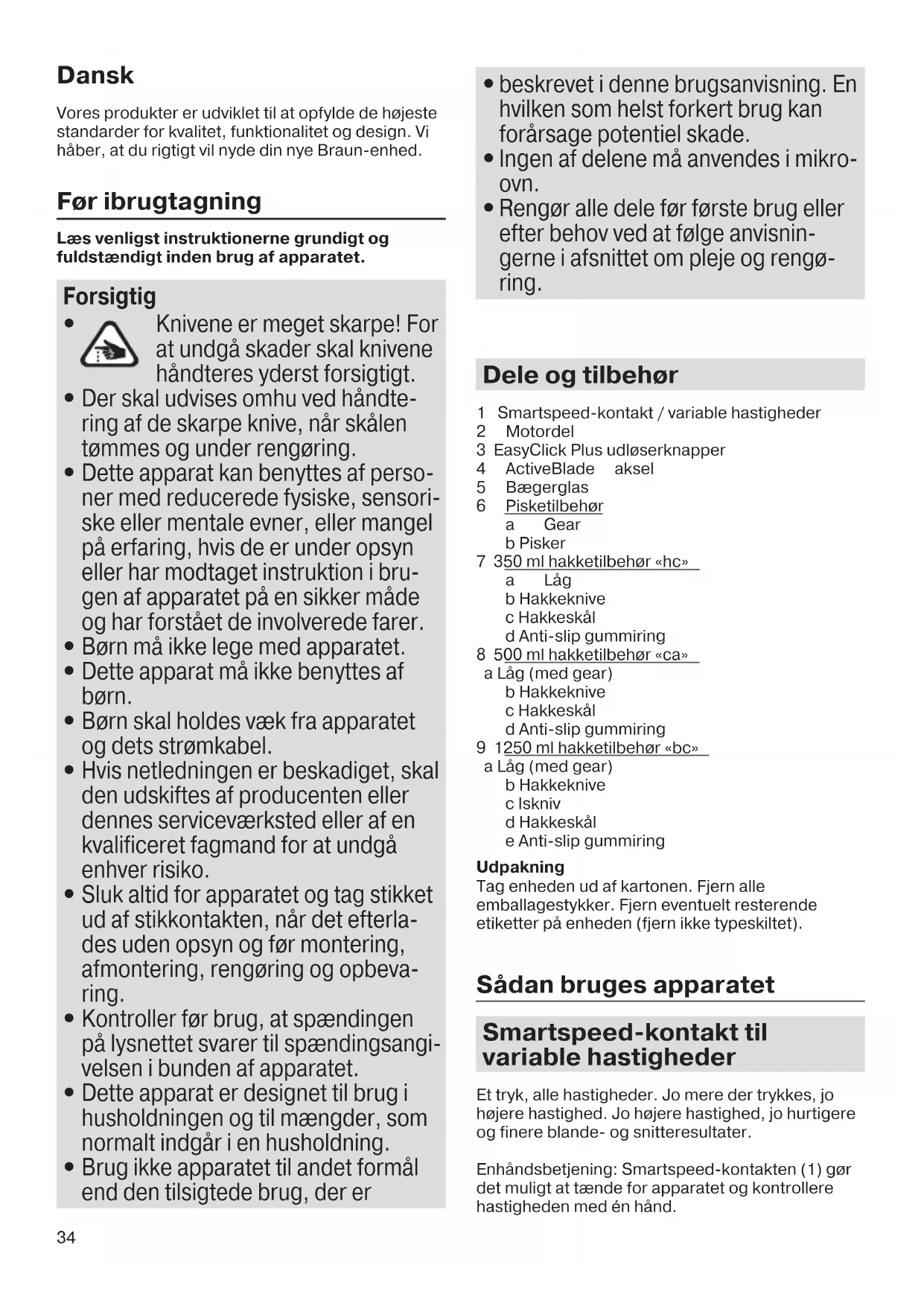 Rengør alle dele før første brug eller efter behov ved at følge anvisnin- gerne i afsnittet om pleje og rengø- ring. Dele og tilbehør 1 Smartspeed-kontakt / variable hastigheder 2 Motordel 3 EasyClick Plus udløserknapper 4 ActiveBlade aksel 5 Bægerglas 6 Pisketilbehør a Gear b Pisker 7 350 ml hakketilbehør «hc» a Låg b Hakkeknive c Hakkeskål d Anti-slip gummiring 8 500 ml hakketilbehør «ca» a Låg (med gear) b Hakkeknive c Hakkeskål d Anti-slip gummiring 9 1250 ml hakketilbehør «bc» a Låg (med gear) b Hakkeknive c Iskniv d Hakkeskål e Anti-slip gummiring Udpakning Tag enheden ud af kartonen. Fjern alle emballagestykker. Fjern eventuelt resterende etiketter på enheden (fjern ikke typeskiltet). Sådan bruges apparatet Smartspeed-kontakt til variable hastigheder Et tryk, alle hastigheder. Jo mere der trykkes, jo højere hastighed. Jo højere hastighed, jo hurtigere og finere blande- og snitteresultater. Enhåndsbetjening: Smartspeed-kontakten (1) gør det muligt at tænde for apparatet og kontrollere hastigheden med én hånd. 5722113444_01_MQ 7000x_7045x_INT_S6-96.indd 345722113444_01_MQ 7000x_7045x_INT_S6-96.indd 34 04.07.19 13:5404.07.19 13:5435 ActiveBlade aksel (A) Håndblenderen er udstyret med en ActiveBlade aksel, som gør det muligt at forlænge kniven ned til bunden af klokken. Justeringen sker automatisk ved det tryk, der kræves ved mikseopgaver, og er især velegnet til at blende hårde fødevarer, eksempelvis rå frugt og grøntsager. Den er også perfekt egnet til tilberedning af dips, saucer, salatdressinger, supper, babymad, såvel som drinks, smoothies og milkshakes. For de bedste resultater bruges højeste hastighed. Samling og betjening