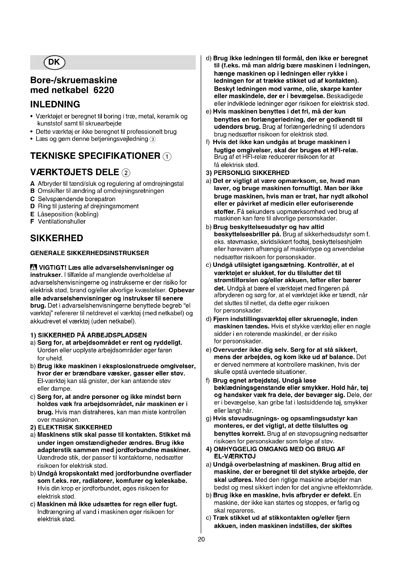 A Afbryder til tænd/sluk og regulering af omdrejningstal B Omskifter til ændring af omdrejningsretningen C Selvspændende borepatron D Ring til justering af drejningsmoment E Låseposition (kobling) F Ventilationshuller SIKKERHED GENERALE SIKKERHEDSINSTRUKSER VIGTIGT! Læs alle advarselshenvisninger og instrukser. I tilfælde af manglende overholdelse af advarselshenvisningerne og instrukserne er der risiko for elektrisk stød, brand og/eller alvorlige kvæstelser. Opbevar alle advarselshenvisninger og instrukser til senere brug. Det i advarselshenvisningerne benyttede begreb “el værktøj” refererer til netdrevet el værktøj (med netkabel) og akkudrevet el værktøj (uden netkabel).