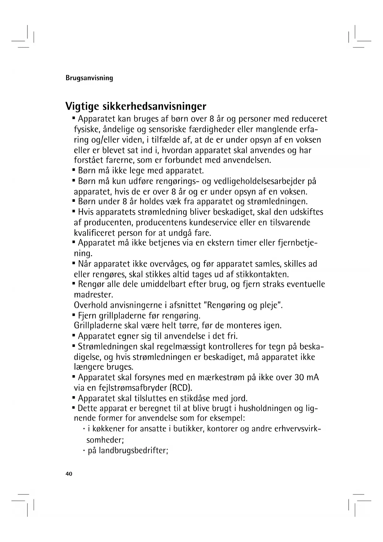 - Apparatet kan bruges af børn over 8 år og personer med reduceret fysiske, åndelige og sensoriske færdigheder eller manglende erfa- ring og/eller viden, i tilfælde af, at de er under opsyn af en voksen eller er blevet sat ind i, hvordan apparatet skal anvendes og har forstået farerne, som er forbundet med anvendelsen.