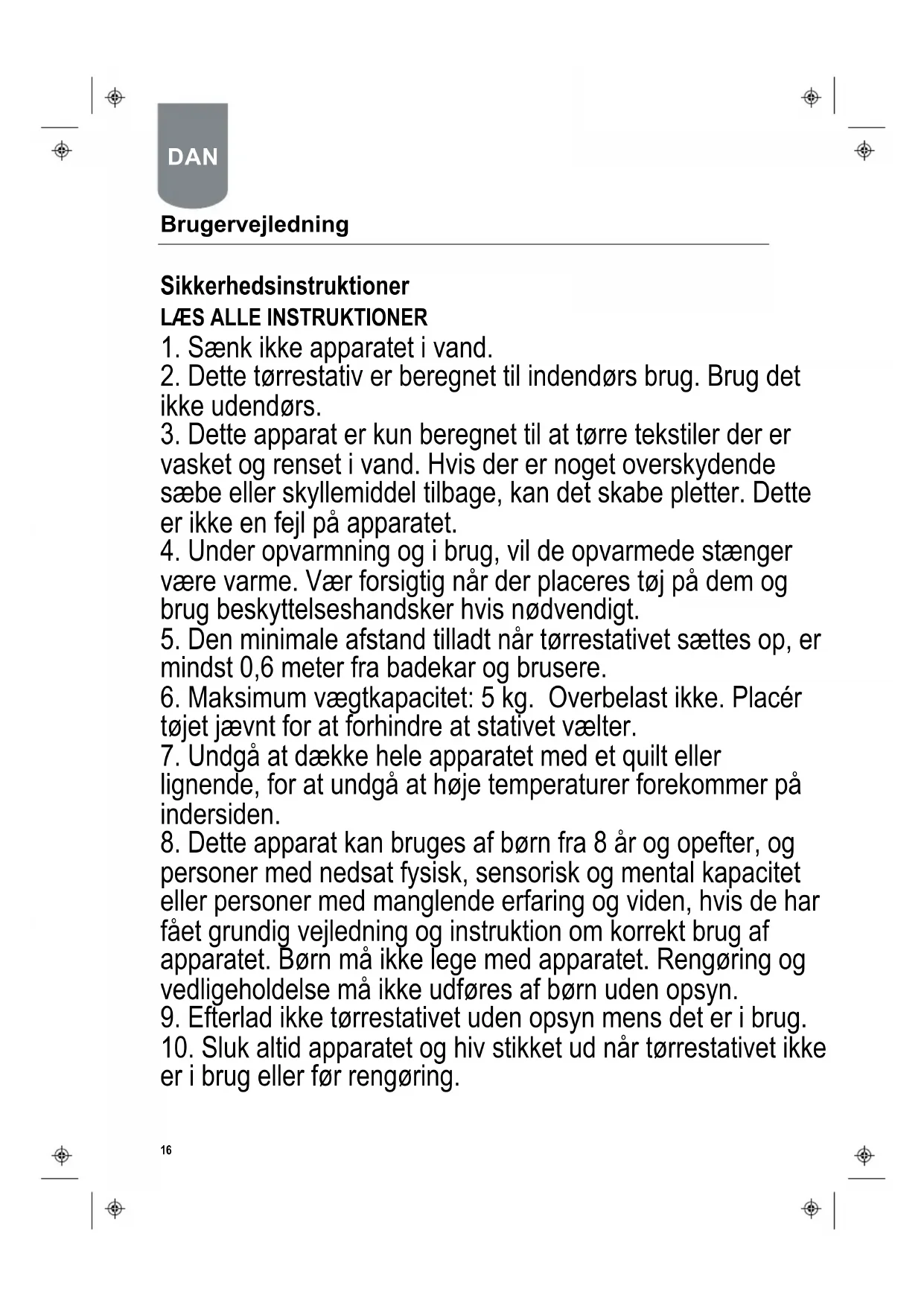 9. Efterlad ikke tørrestativet uden opsyn mens det er i brug.