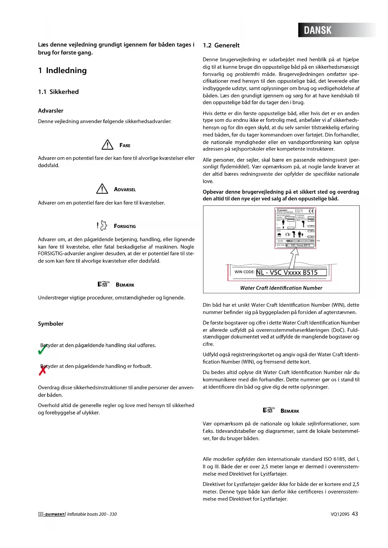 Denne brugervejledning er udarbejdet med henblik på at hjælpe dig til at kunne bruge din oppustelige båd på en sikkerhedsmæssigt forsvarlig og problemfri måde. Brugervejledningen omfatter spe- cikationer med hensyn til den oppustelige båd, det leverede eller indbyggede udstyr, samt oplysninger om brug og vedligeholdelse af båden. Læs den grundigt igennem og sørg for at have kendskab til den oppustelige båd før du tager den i brug. Hvis dette er din første oppustelige båd, eller hvis det er en anden type som du endnu ikke er fortrolig med, anbefaler vi af sikkerheds- hensyn og for din egen skyld, at du selv samler tilstrækkelig erfaring med båden, før du tager kommandoen over fartøjet. Din forhandler, de nationale myndigheder eller en vandsportforening kan oplyse adressen på sejlsportskoler eller kompetente instruktører. Alle personer, der sejler, skal bære en passende redningsvest (per- sonligt ydemiddel). Vær opmærksom på, at nogle lande kræver at der altid bæres redningsveste der opfylder de specikke nationale love. Opbevar denne brugervejledning på et sikkert sted og overdrag den altid til den nye ejer ved salg af den oppustelige båd. DANSK44 VQ12095 Inatable boats 200- 330