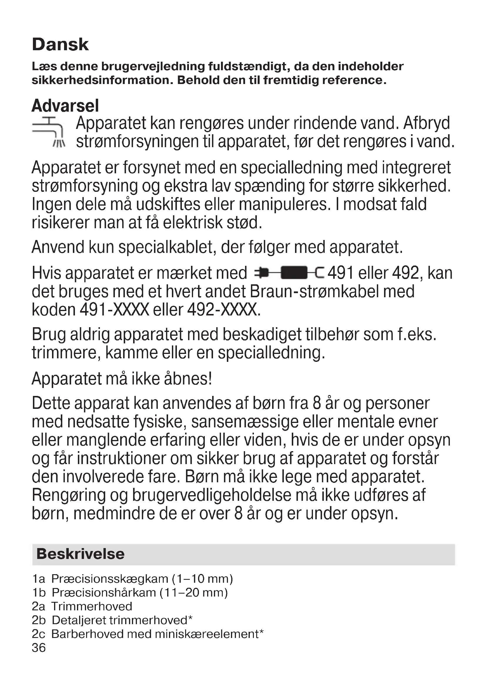 - Brug trimmerhovedet (2a) uden kammen, med det detaljerede trimmerhoved (2b) eller shaveren med miniskæreblad (2c) til at forme bakkenbarter, overskæg og kort skæg. Rejselås Tryk på tænd-/sluk-knappen (4) i 3 sekunder for at låse apparatet. Et bip bekræfter, at rejselåsen er aktiveret. Du låser op igen ved at trykke på tænd-/sluk-knappen i 3 sekunder. Der høres 3 bip, hvis dit forsøg på at låse op mislykkes. Prøv igen, eller sæt apparatet i stikkontakten. Rengøring og vedligeholdelse