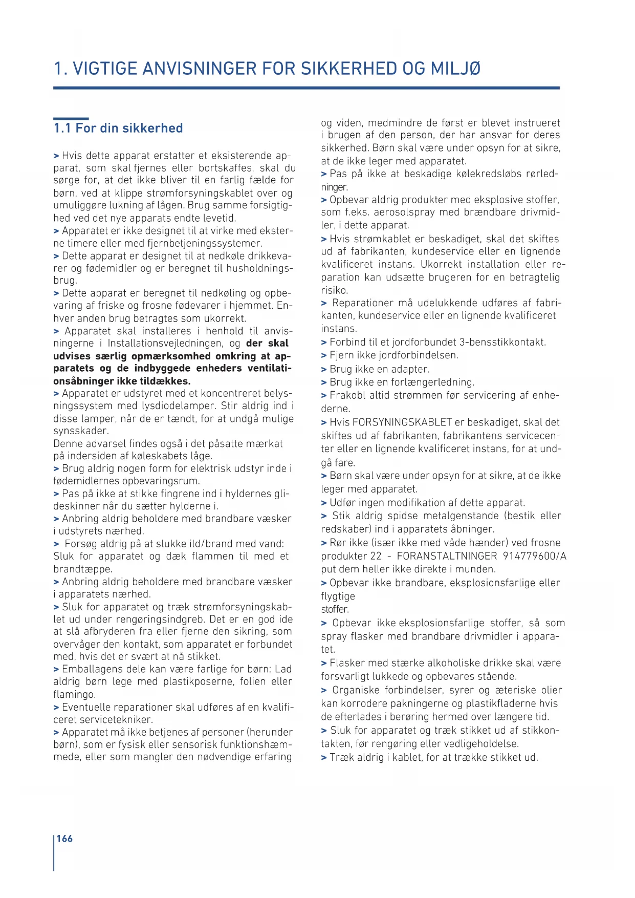 > Hvis dette apparat erstatter et eksisterende ap- parat, som skal fjernes eller bortskaes, skal du sørge for, at det ikke bliver til en farlig fælde for børn, ved at klippe strømforsyningskablet over og umuliggøre lukning af lågen. Brug samme forsigtig- hed ved det nye apparats endte levetid. > Apparatet er ikke designet til at virke med ekster- ne timere eller med fjernbetjeningssystemer. > Dette apparat er designet til at nedkøle drikkeva- rer og fødemidler og er beregnet til husholdnings- brug. > Dette apparat er beregnet til nedkøling og opbe- varing af friske og frosne fødevarer i hjemmet. En- hver anden brug betragtes som ukorrekt. > Apparatet skal installeres i henhold til anvis- ningerne i Installationsvejledningen, og der skal udvises særlig opmærksomhed omkring at ap- paratets og de indbyggede enheders ventilati- onsåbninger ikke tildækkes. > Apparatet er udstyret med et koncentreret belys- ningssystem med lysdiodelamper. Stir aldrig ind i disse lamper, når de er tændt, for at undgå mulige synsskader. Denne advarsel ndes også i det påsatte mærkat på indersiden af køleskabets låge. > Brug aldrig nogen form for elektrisk udstyr inde i fødemidlernes opbevaringsrum. > Pas på ikke at stikke ngrene ind i hyldernes gli- deskinner når du sætter hylderne i. > Anbring aldrig beholdere med brandbare væsker i udstyrets nærhed. > Forsøg aldrig på at slukke ild/brand med vand: Sluk for apparatet og dæk ammen til med et brandtæppe. > Anbring aldrig beholdere med brandbare væsker i apparatets nærhed. > Sluk for apparatet og træk strømforsyningskab- let ud under rengøringsindgreb. Det er en god ide at slå afbryderen fra eller fjerne den sikring, som overvåger den kontakt, som apparatet er forbundet med, hvis det er svært at nå stikket. > Emballagens dele kan være farlige for børn: Lad aldrig børn lege med plastikposerne, folien eller amingo. > Eventuelle reparationer skal udføres af en kvali- ceret servicetekniker. > Apparatet må ikke betjenes af personer (herunder børn), som er fysisk eller sensorisk funktionshæm- mede, eller som mangler den nødvendige erfaring og viden, medmindre de først er blevet instrueret i brugen af den person, der har ansvar for deres sikkerhed. Børn skal være under opsyn for at sikre, at de ikke leger med apparatet. > Pas på ikke at beskadige kølekredsløbs rørled- ninger. > Opbevar aldrig produkter med eksplosive stoer, som f.eks. aerosolspray med brændbare drivmid- ler, i dette apparat. > Hvis strømkablet er beskadiget, skal det skiftes ud af fabrikanten, kundeservice eller en lignende kvaliceret instans. Ukorrekt installation eller re- paration kan udsætte brugeren for en betragtelig risiko. > Reparationer må udelukkende udføres af fabri- kanten, kundeservice eller en lignende kvaliceret instans. > Forbind til et jordforbundet 3-bensstikkontakt. > Fjern ikke jordforbindelsen. > Brug ikke en adapter. > Brug ikke en forlængerledning. > Frakobl altid strømmen før servicering af enhe- derne. > Hvis FORSYNINGSKABLET er beskadiget, skal det skiftes ud af fabrikanten, fabrikantens servicecen- ter eller en lignende kvaliceret instans, for at und- gå fare. > Børn skal være under opsyn for at sikre, at de ikke leger med apparatet. > Udfør ingen modikation af dette apparat. > Stik aldrig spidse metalgenstande (bestik eller redskaber) ind i apparatets åbninger. > Rør ikke (især ikke med våde hænder) ved frosne produkter 22 - FORANSTALTNINGER 914779600/A put dem heller ikke direkte i munden. > Opbevar ikke brandbare, eksplosionsfarlige eller ygtige stoer. > Opbevar ikke eksplosionsfarlige stoer, så som spray asker med brandbare drivmidler i appara- tet. > Flasker med stærke alkoholiske drikke skal være forsvarligt lukkede og opbevares stående. > Organiske forbindelser, syrer og æteriske olier kan korrodere pakningerne og plastikaderne hvis de efterlades i berøring hermed over længere tid. > Sluk for apparatet og træk stikket ud af stikkon- takten, før rengøring eller vedligeholdelse. > Træk aldrig i kablet, for at trække stikket ud.167 DADA
