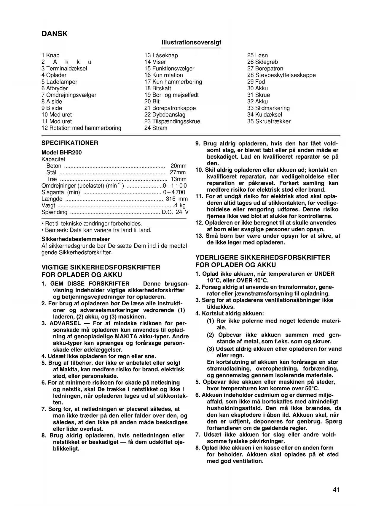 - Anvend ikke “hammerboring” funktionen når borepatro- nen er monteret på værktøjet. Borepatronen kan blive beskadiget. Udblæsningskugle (Fig. 19) Anvend udblæsningskuglen til at blæse hullet rent. Støvopsamler (Fig.20) Anvend støvopsamleren for at forhindre støv i at drysse ned over værktøjet og Dem selv når der foretages borin- ger i større højder. Sæt støvopsamleren på boret. Støv- samleren kan sættes på værktøj af følgende størrelse. Fod Afmontér foden, når akku B2417 anvendes. Dette vil medvirke til at maskinen kan stilles mere stabilt. (Fig. 21) Montér foden, når akku B2430 anvendes. Dette vil medvirke til at maskinen kan stilles mere stabilt. (Fig. 22) VEDLIGEHOLDELSE ADVARSEL: Sørg altid for at maskinen er slukket, og at akkuen er taget ud før der gennemføres noget arbejde på selve maskinen. Udskiftning af kul (Fig. 23 og 24) Udtag og efterse kullene med jævne mellemrum. Udskift dem, når de er slidt ned til slidmarkeringen. Hold kullene rene, så de altid passer ind i holderne. Begge kul skal udskiftes samtidigt. Brug kun identiske kul. Benyt en skruetrækker til at fjerne kuldækslerne. Tag de slidte kul ud, sæt de nye i, og fastgør kuldækslerne. For at opretholde produktets sikkerhed og pålidelighed, må istandsættelse, vedligeholdelse eller justering kun udføres af et autoriseret Makita service center. Værktøjsdiameter (mm) Støvopsamler 5 6 – 14,5 Støvopsamler 9 12– 1646 SVENSKA Förklaring av allmän översikt 1 Knapp 2 Kraftkassett 3 Kontaktskydd 4 Batteriladdare 5 Laddningslampa 6 Strömbrytare 7 Backlägesomkopplare 8Sida A 9Sida B 10 Medurs 11 Moturs 12 Borrning med rotation och slag 13 Låsknapp 14 Visare 15 Omkopplare 16 Borrning endast med rotation 17 Borrning endast med slag 18 Borrskaft 19 Borrfett 20 Borr 21 Chuckkåpa 22 Djupanslag 23 Vingskruv 24 Drag åt 25 Lossa 26 Sidogrepp 27 Borrchuck 28 Dammkopp 29 Verktygsfot 30 Kraftkassett 31 Skruv 32 Kraftkassett 33 Slitgränsmarkering 34 Kolhållarlock 35 Skruvmejsel TEKNISKA DATA Modell BHR200 Kapacitet Betong ................................................................20 mm Stål .....................................................................27 mm Trä ......................................................................13 mm Obelastat varvtal (min