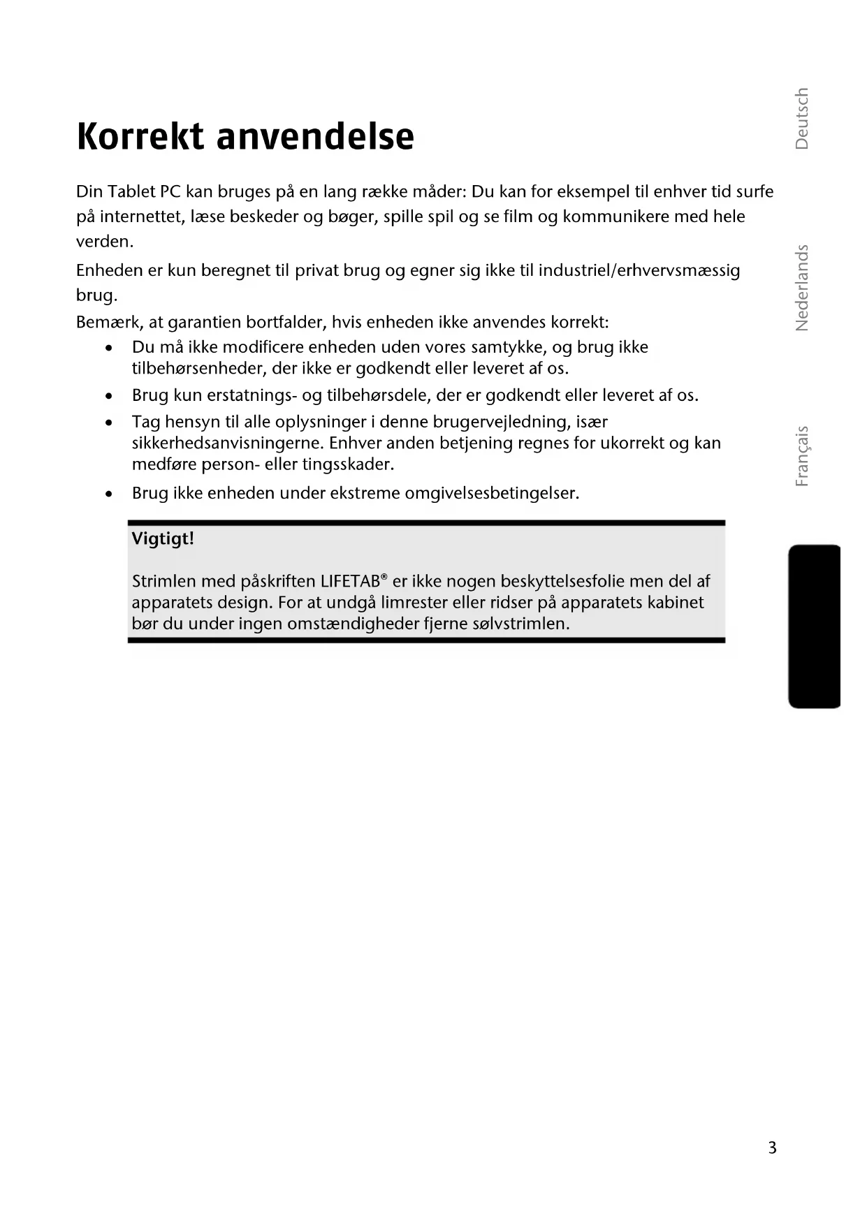 Varemærker: Google, Android og andre Google-varemærker er registrerede varemærker tilhørende Google Inc. Fremstillet under licens fra Dolby Laboratories. Dolby og det dobbelte D-symbol er varemærker tilhørende Dolby Laboratories. Andre varemærker er de respektive ejeres ejendom. Ret til tekniske ændringer forbeholdes.3 Français Nederlands Deutsch Dansk English Korrekt anvendelse Din Tablet PC kan bruges på en lang række måder: Du kan for eksempel til enhver tid surfe på internettet, læse beskeder og bøger, spille spil og se film og kommunikere med hele verden. Enheden er kun beregnet til privat brug og egner sig ikke til industriel/erhvervsmæssig brug. Bemærk, at garantien bortfalder, hvis enheden ikke anvendes korrekt: Du må ikke modificere enheden uden vores samtykke, og brug ikke tilbehørsenheder, der ikke er godkendt eller leveret af os. Brug kun erstatnings- og tilbehørsdele, der er godkendt eller leveret af os. Tag hensyn til alle oplysninger i denne brugervejledning, især sikkerhedsanvisningerne. Enhver anden betjening regnes for ukorrekt og kan medføre person- eller tingsskader. Brug ikke enheden under ekstreme omgivelsesbetingelser. Vigtigt! Strimlen med påskriften LIFETAB® er ikke nogen beskyttelsesfolie men del af apparatets design. For at undgå limrester eller ridser på apparatets kabinet bør du under ingen omstændigheder fjerne sølvstrimlen.4 Konformitetsinformationer Denne Tablet-PC indeholder det følgende radioudstyr: Wireless LAN Bluetooth