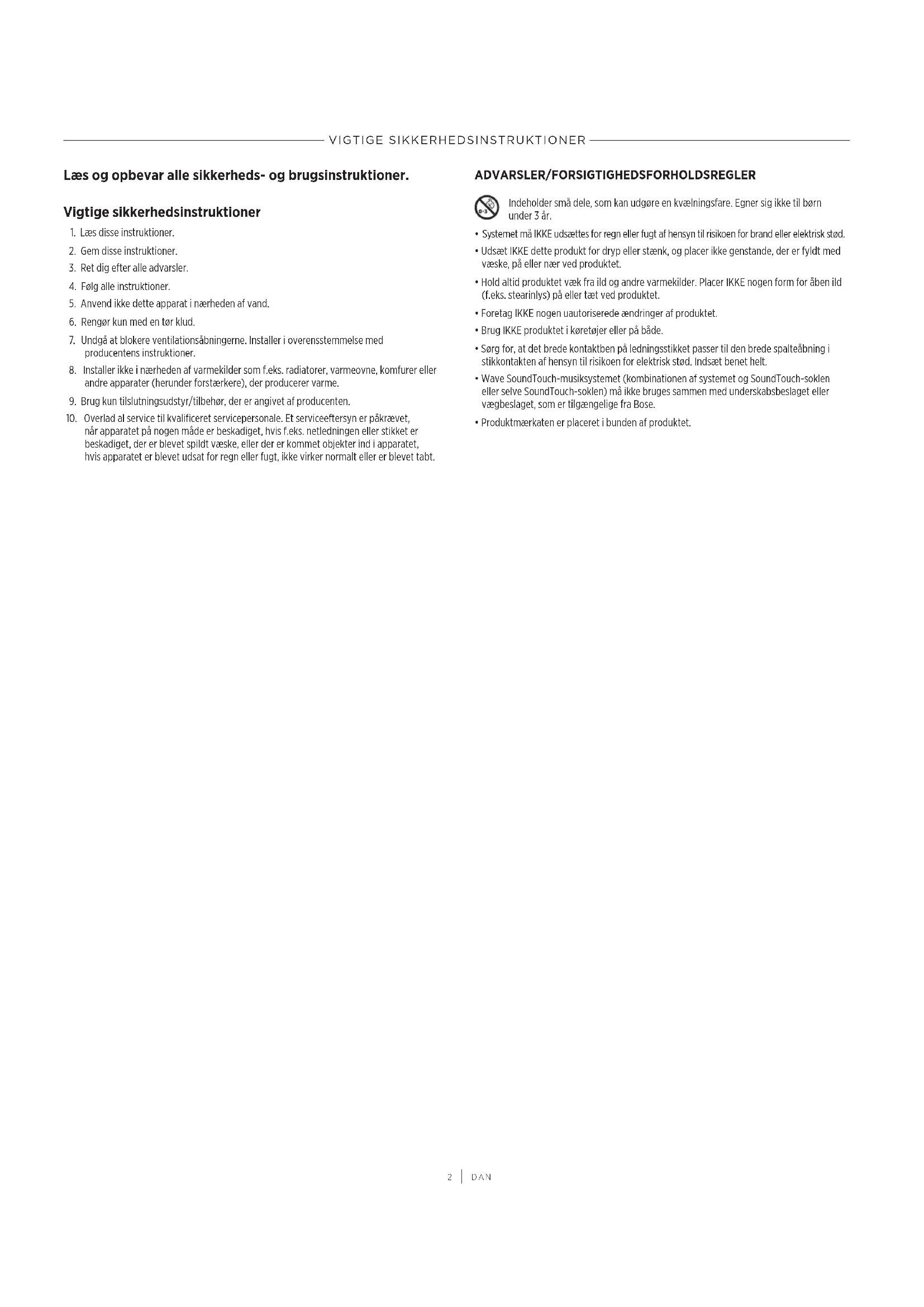når apparatet på nogen måde er beskadiget, hvis f.eks. netledningen eller stikket er beskadiget, der er blevet spildt væske, eller der er kommet objekter ind i apparatet, hvisapparatet er blevet udsat for regn eller fugt, ikke virker normalt eller er blevet tabt. ADVARSLER/FORSIGTIGHEDSFORHOLDSREGLER Indeholder små dele, som kan udgøre en kvælningsfare. Egner sig ikke til børn under3 år.
