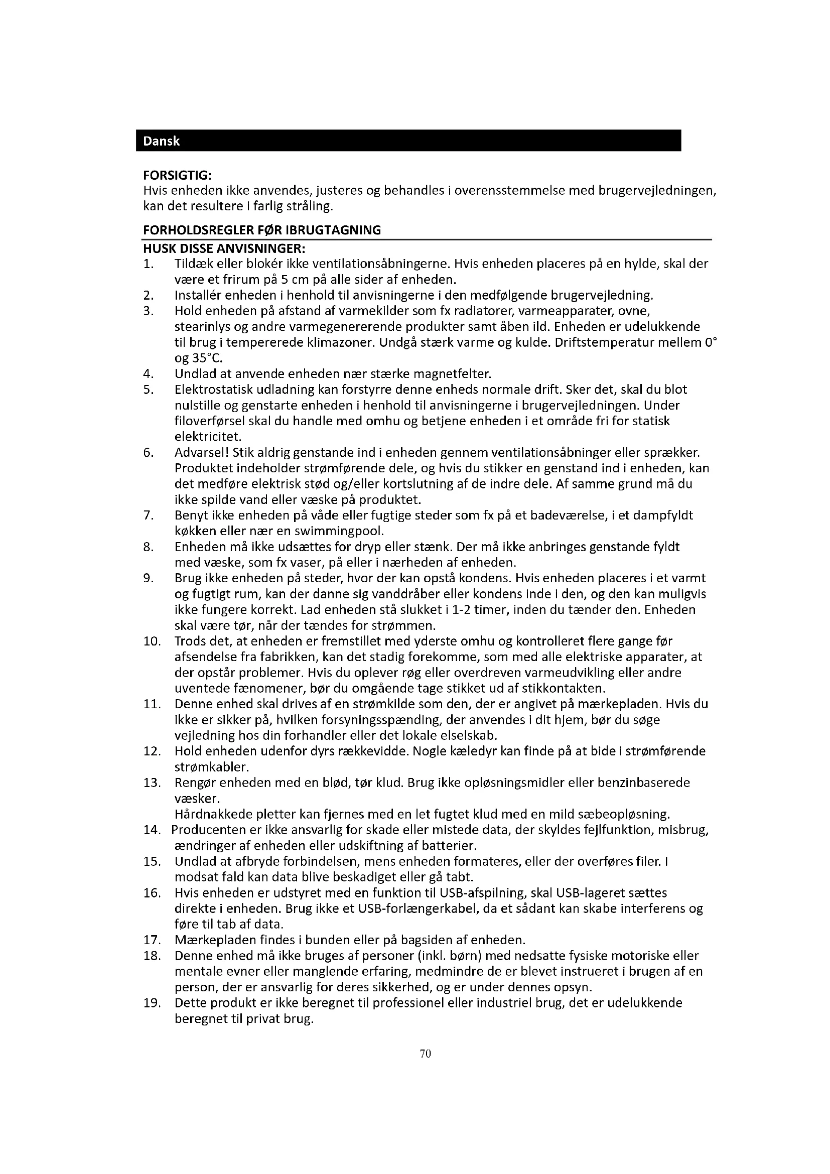19. Dette produkt er ikke beregnet til professionel eller industriel brug, det er udelukkende