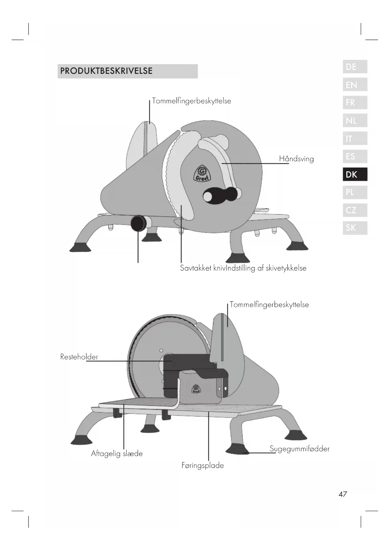 PRODUKTBESKRIVELSE Tommelfingerbeskyttelse Håndsving Savtakket knivIndstilling af skivetykkelse Aftagelig slæde Føringsplade Tommelfingerbeskyttelse Resteholder Sugegummifødder48 FORORD Kære kunde, Ved købet af denne manuelle pålægsmaskine, har du gjort et godt valg. Du har købt et anerkendt kvalitetsprodukt. Vi takker for dit køb, og ønsker dig held og lykke med din nye pålægsmaskine.