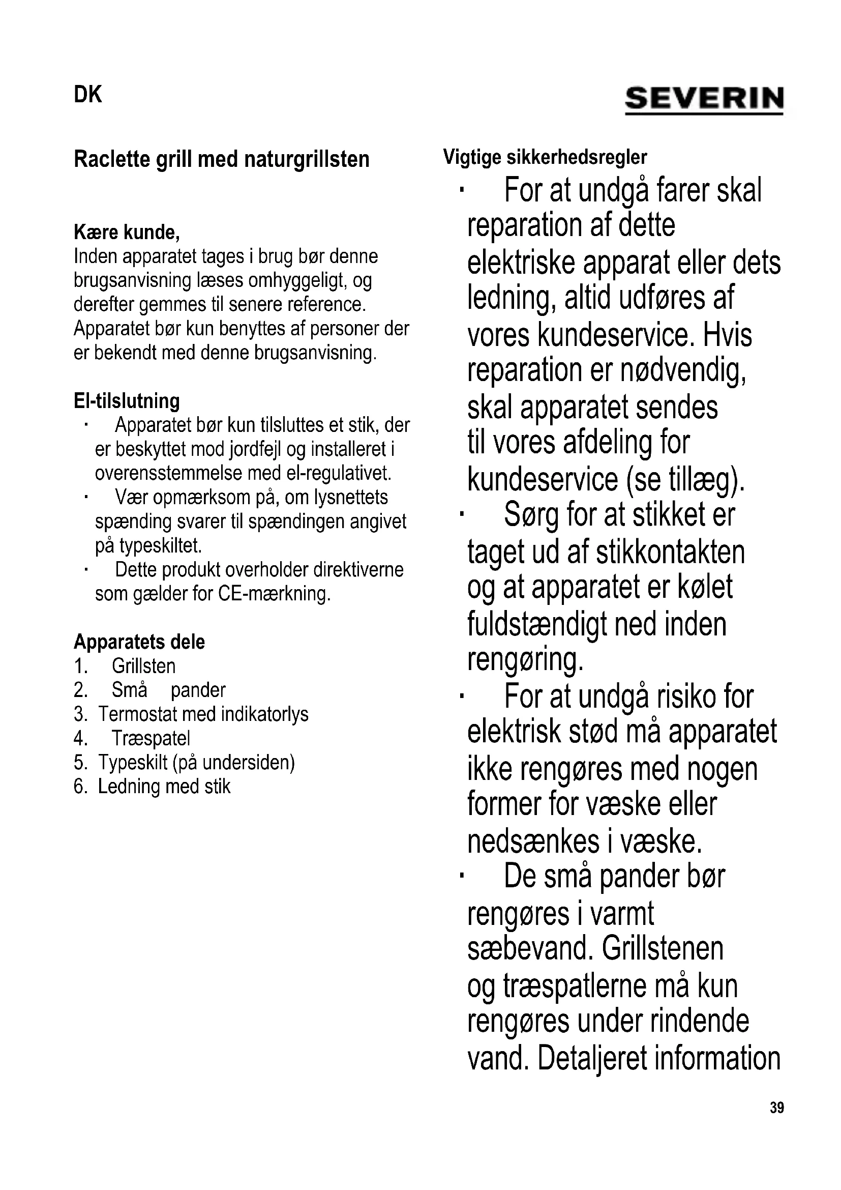 Vigtige sikkerhedsregler ∙ For at undgå farer skal reparation af dette elektriske apparat eller dets ledning, altid udføres af vores kundeservice. Hvis reparation er nødvendig, skal apparatet sendes til vores afdeling for kundeservice (se tillæg). ∙ Sørg for at stikket er taget ud af stikkontakten og at apparatet er kølet fuldstændigt ned inden rengøring. ∙ For at undgå risiko for elektrisk stød må apparatet ikke rengøres med nogen former for væske eller nedsænkes i væske. ∙ De små pander bør rengøres i varmt sæbevand. Grillstenen og træspatlerne må kun rengøres under rindende vand. Detaljeret information DK40 om rengøring af apparatet fi ndes i afsnittet om Rengøring og vedligehold. ∙ Apparatet er ikke beregnet til brug ved hjælp af en ekstern timer eller et separat fjernstyringssystem. ∙ Dette apparat er beregnet til privat brug eller i tilsvarende omgivelser, såsom - i tekøkkener, kontorer eller andre mindre virksomheder, - landbrugsvirksomheder, - af kunder på hoteller, moteller m.m. og tilsvarende foretagender, - B&B pensionater. ∙ Dette apparat kan benyttes af børn (som er mindst 8 år) og af personer med reducerede fysiske, sensoriske eller mentale evner, eller mangel på erfaring eller viden, såfremt de har fået vejledning og instruktion i brugen af dette apparat og fuldt ud forstår alle farer og forholdsregler vedrørende sikkerheden som brug af apparatet medfører. ∙ Børn må aldrig få lov til at lege med apparatet. ∙ Børn må aldrig få lov til at udføre rengørings- eller vedligeholdelsesarbejde på dette apparat, medmindre de er under opsyn og mindst 8 år gamle. ∙ Apparatet og dets ledning må altid holdes væk fra børn som er yngre en 8 år. ∙ Advarsel: Hold børn væk fra emballeringen, da denne udgør en mulig risiko for tilskadekomst, ved f.eks. kvælning. ∙ Inden apparatet benyttes må både apparatet og dets tilbehør ses grundigt efter for fejl. Hvis apparatet for eksempel har været tabt på en hård overfl ade eller der er blevet trukket i ledningen med stor kraft, må det ikke længere benyttes: Selv skader der ikke er synlige kan have41 ugunstig indvirkning på sikkerheden ved brug af apparatet. ∙ Apparatets overfl ader, grillstenen og de små pander bliver meget varme under brug. Advarsel: Der er risiko for forbrænding. ∙ Efterlad ikke tilsluttede apparater uden opsyn. ∙ Ledningen skal altid holdes langt væk fra apparatets varme dele. ∙ Under brug må apparatet placeres på en stabil og plan fl ade, der tåler stænk og sprøjt. Hvis der tilberedes mad med et højt fedt- eller fugtindhold, kan stænk ikke undgås. ∙ Placer ikke grillen tæt på en væg eller i et hjørne, og sørg for at der aldrig er brændbare materialer i nærheden af den. ∙ Placer ikke apparatet på eller nær ved varme overfl ader, åben ild eller letantændelige dampe. ∙ Advarsel: Benyt aldrig apparatet udendørs. ∙ Før brug må grillstenen placeres øverst på apparatet over varmeelementet. ∙ Tag altid stikket ud af stikkontakten - efter brug, - i tilfælde af fejlfunktion, - inden rengøring af apparatet. ∙ Træk aldrig i selve ledningen, når ledningen tages ud af stikkontakten; tag altid fat i selve stikket. ∙ Advarsel: Dette apparat bør kun benyttes med det tilbehør, som producenten foreskriver. ∙ Lad altid apparatet få tilstrækkelig tid til at køle af inden grillstenen tages af, og inden apparatet rengøres eller sættes til side. ∙ Vi påtager os intet ansvar for skader, som skyldes misbrug eller manglende overholdelse af denne brugsanvisning. Anvendelse Dette apparat er en elektrisk raclette grill, der er egnet til fedtfattig grillning af kød, fi sk og grøntsager og til ost ‘au gratin’. Enhver anden anvendelse, end den beskrevet i disse instruktioner, må anses for ukorrekt og kan medføre personskader eller materielle skader. Før brug ∙ Fjern al emballage fuldstændigt. ∙ Inden grillen tages i brug første gang, må grillstenen, træspatlerne og de små pander tørres af med en fugtig klud. ∙ Varm grillen med sten og de små pander op i ca. 10 min., uden nogen fødevarer, for at fjerne den lugt der typisk opstår når en grill tændes første gang (en smule røg kan også forekomme). Af den grund bør man sørge for tilstrækkelig udluftning ved at åbne vinduer eller yderdøre. ∙ Lad apparatet køle helt ned og rengør det derefter som beskrevet i Rengøring og vedligehold. Grillsten ∙ Før brug, monter grillstenen på apparatet med den polerede side opad. Advarsel: Anbring aldrig en kold grillsten ovenpå et opvarmet varmeelement. ∙ Grillstenen kan benyttes til tilberedning af grønsager, samt tynde skiver af f.eks.42 kød eller fi sk efter eget valg. ∙ Grillstenen er fremstillet af naturmateriale. Mindre revner, der opstår som følge af stenens udvidelse og sammentrækning under opvarmning og afkøling, og gradvis ændring til en mørkere farve, er helt normalt og uden betydning for stenens funktion. ∙ Placer aldrig dybfrosne fødevarer eller mad der indeholder eddike (såsom syltede agurker eller sennep) på grillstenen. Justerbar termostat og indikatorlys ∙ Med termostaten sat helt til højre er varmeelementet permanent tændt. Hvis den fl yttes til venstre, slukker og tænder apparatet skiftevis. ∙ Det røde indikatorlys forbliver tændt så længe varmeelementet er tændt. ∙ Efter brug drejes termostaten helt til venstre. Husk også altid at tage stikket ud af stikkontakten. Betjening Tip: For den optimale grilloplevelse, bør kødet tages ud af køleskabet og stå tildækket på en tallerken, ca. 30 minutter inden det grilles. ∙ Monter grillstenen på apparatet med den polerede side opad. ∙ Sæt stikket i en passende stikkontakt og drej termostaten så langt til højre som muligt. ∙ Lad apparatet forvarme i ca. 25 minutter for at opnå den nødvendige temperatur. ∙ Placer de fødevarer der skal grilles på grillstenen. ∙ Læg racletteosten 