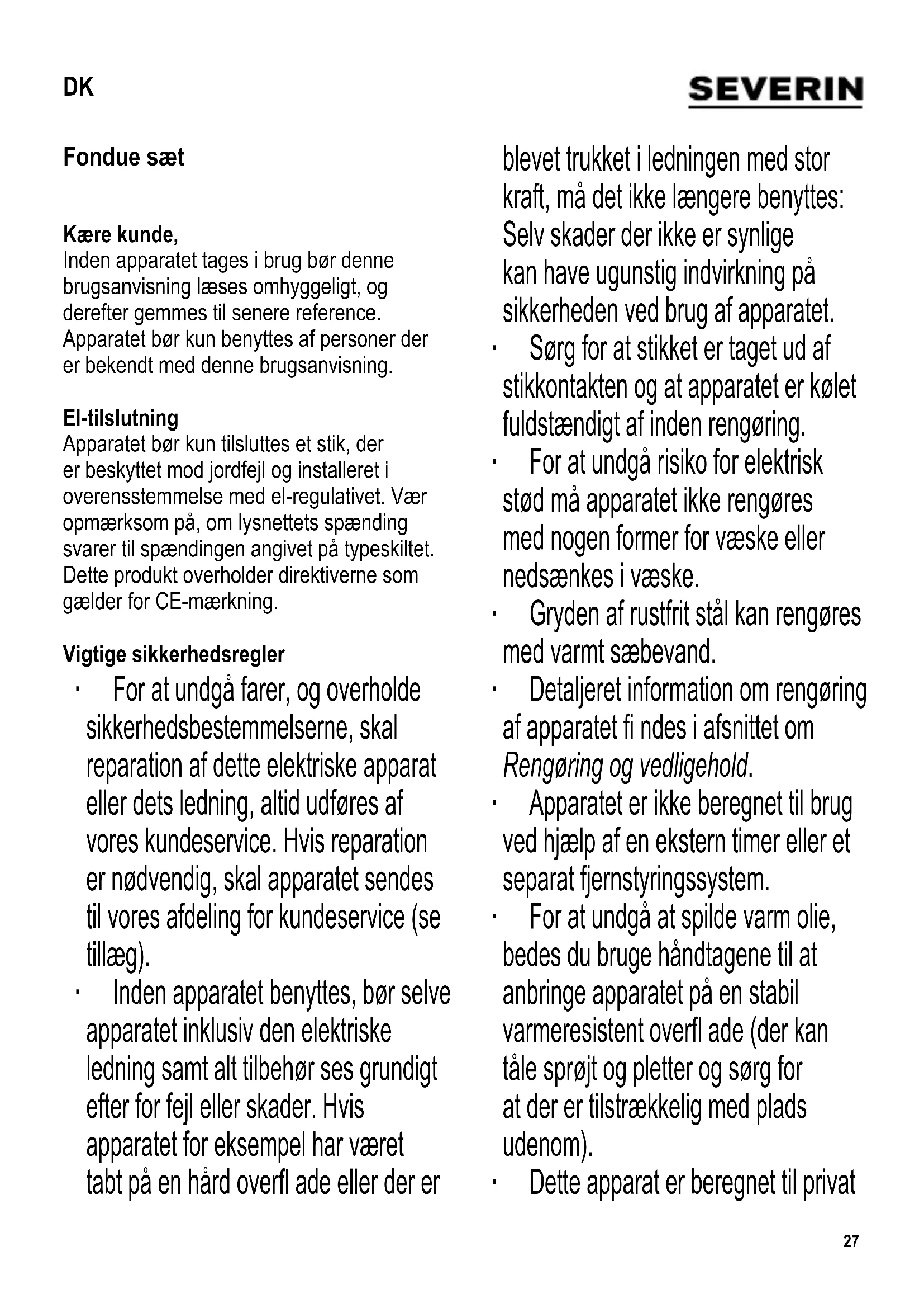 d 8 år. ∙ Advarsel: Hold børn væk fra emballeringen, da denne udgør en mulig risiko for tilskadekomst, ved f.eks. kvælning. ∙ Advarsel: Varmepladen og gryden bliver meget varme under brug. ∙ Tag aldrig i den varme gryde. ∙ Tilslut først produktet, når den fyldte gryde er anbragt på varmepladen. Lad aldrig fonduegryden være uden opsyn mens den er tilsluttet. ∙ Fedtstof kan antændes ved overophedning. I så fald, tag stikket ud af kontakten og sluk ilden ved at tildække gryden med et låg eller lignende. Hæld aldrig vand på varmt eller brændende fedt! ∙ Flyt aldrig fonduegryden, når den er varm. Flydende, varmt fedtstof kan give svære forbrændinger. ∙ Benyt kun fonduegryden sammen med den tilhørende varmeplade, da denne varmeplade er forsynet med en tilpasset temperaturregulator. ∙ Anbring fonduesættet på et varmebestandigt underlag, der også kan tåle fedtstænk. ∙ Hold let antændelige genstande borte fra fonduegryden. ∙ Hold ledningen borte fra apparatets varme dele, og placer den således at fonduesættet ikke kan trækkes på gulvet. ∙ Tag altid stikket ud af stikkontakten - efter brug, - i tilfælde af fejlfunktion, - inden rengøring af apparatet. ∙ Træk aldrig i selve ledningen, når ledningen tages ud af stikkontakten; tag altid fat i selve stikket. ∙ Vi påtager os intet ansvar hvis beskadigelse skyldes ureglementeret brug eller hvis denne brugsanvisning ikke29 er overholdt. Før ibrugtagen Rengør apparatet, gryden og tilbehøret som anvist i afsnittet om Rengøring og vedligehold. Således benyttes fonduesættet ∙ Fyld gryden med den nødvendige mængde fedtstof, fond eller ost, i henhold til opskriften. Ved anvendelse af fedtstof eller fond skal man sørge for at min. og max (○) markeringerne overholdes. Den maksimale kapacitet afhænger af hvilken type gryde der anvendes (max. markering = maksimal kapacitet). ∙ Anbring gryden på varmepladen og sæt stikket i stikkontakten. Fondue med kød ∙ Drej temperaturvælgeren hen på positionen