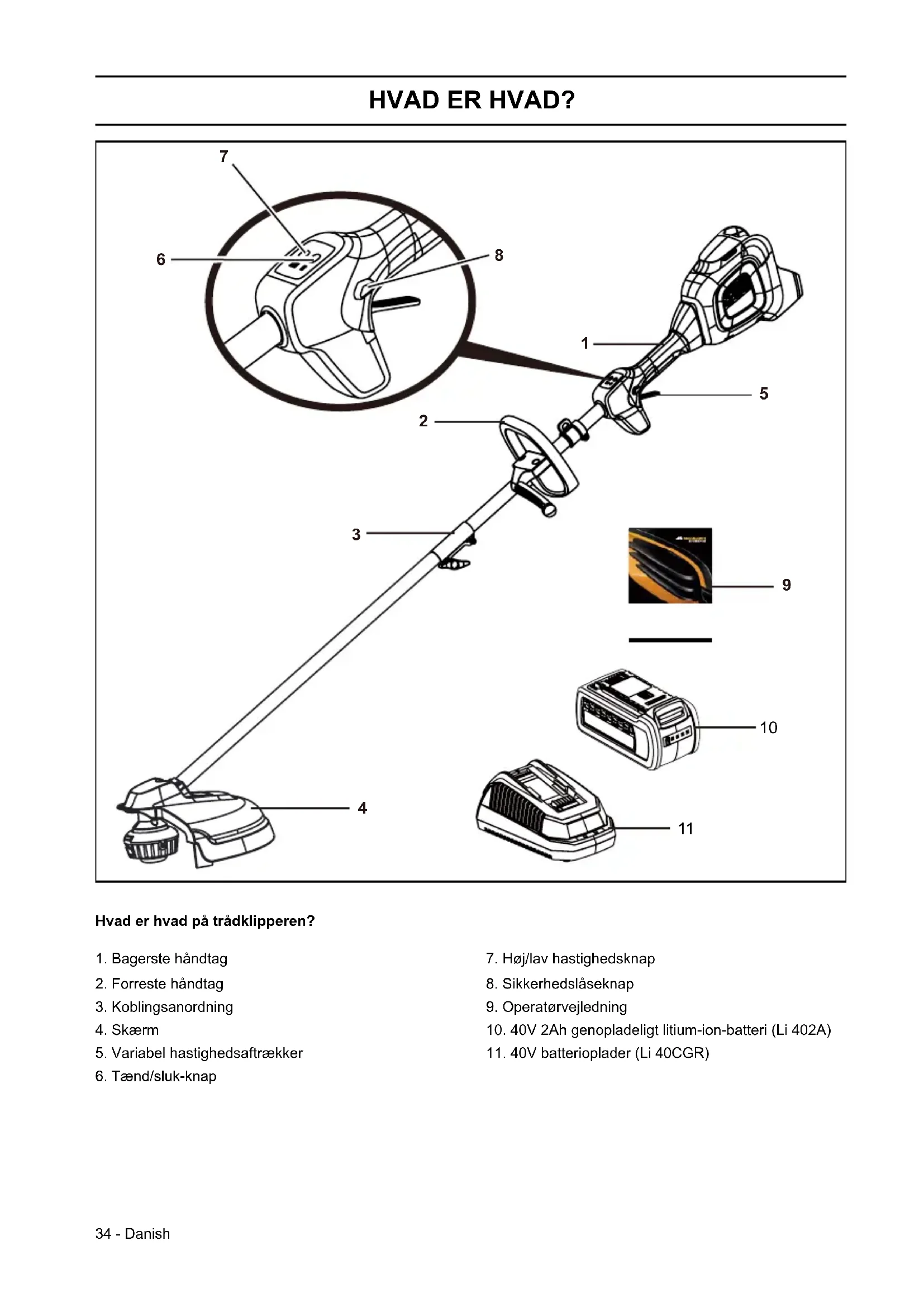 ADVARSEL! En rydningssav, buskrydder eller trimmer kan, hvis den bruges forkert eller skødesløst, være et farligt redskab, som kan forårsage alvorlige skader eller dødsfald for brugeren eller andre. Det er meget vigtigt, at du læser og forstår indholdet i denne brugsanvisning. INDHOLD34 - Danish HVAD ER HVAD? Hvad er hvad på trådklipperen?