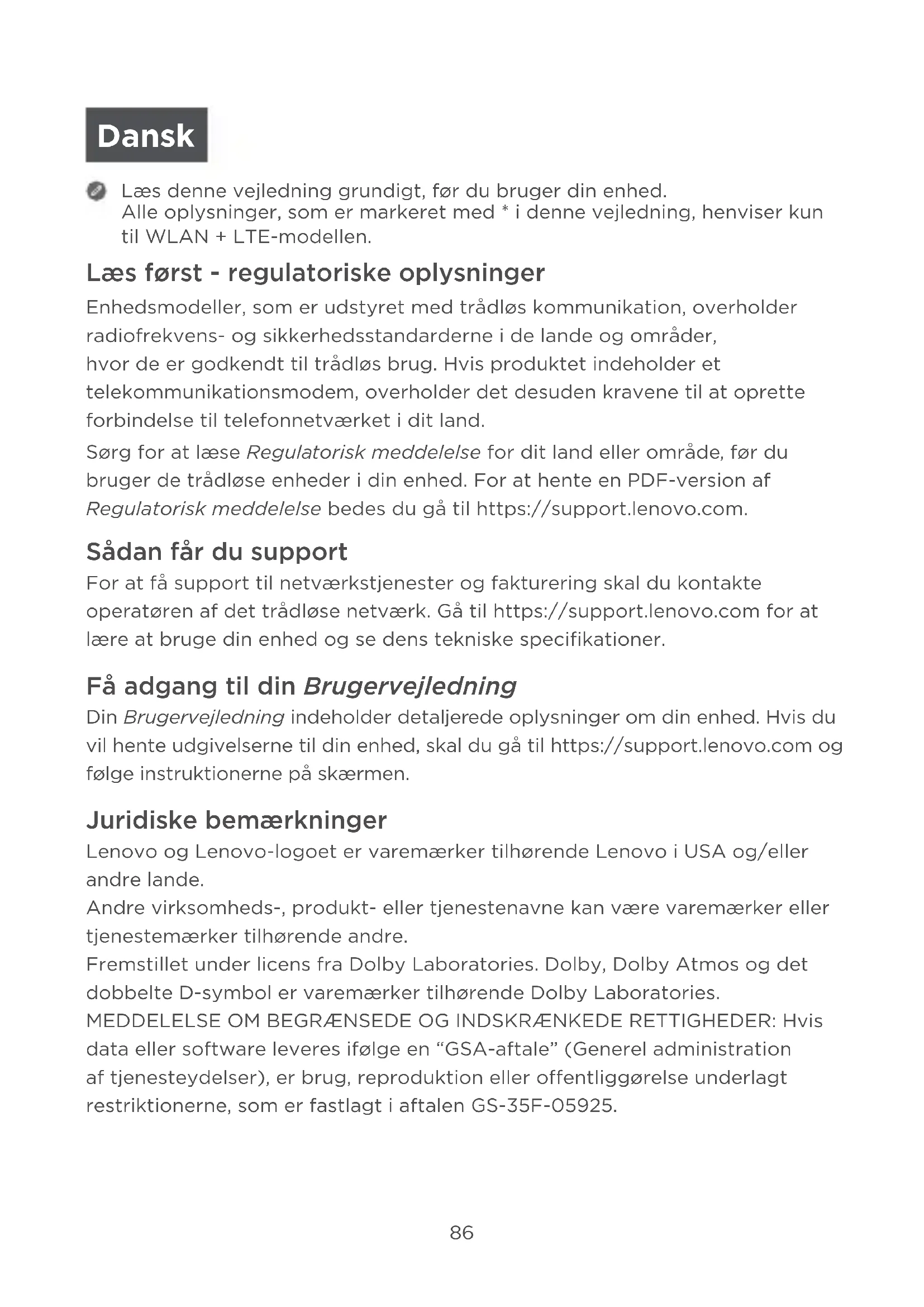 - Du kan også gå til http://support.lenovo.com og se den aktuelle liste med sprog, som Omgivende tilstand understøtter. Google Assistent kræver en internetforbindelse og er muligvis ikke tilgængelig i alle lande og på alle sprog.Läs den här handboken noga innan du använder din enhet. All information som är märkt med * i den här handboken gäller endast modellen WLAN + LTE.