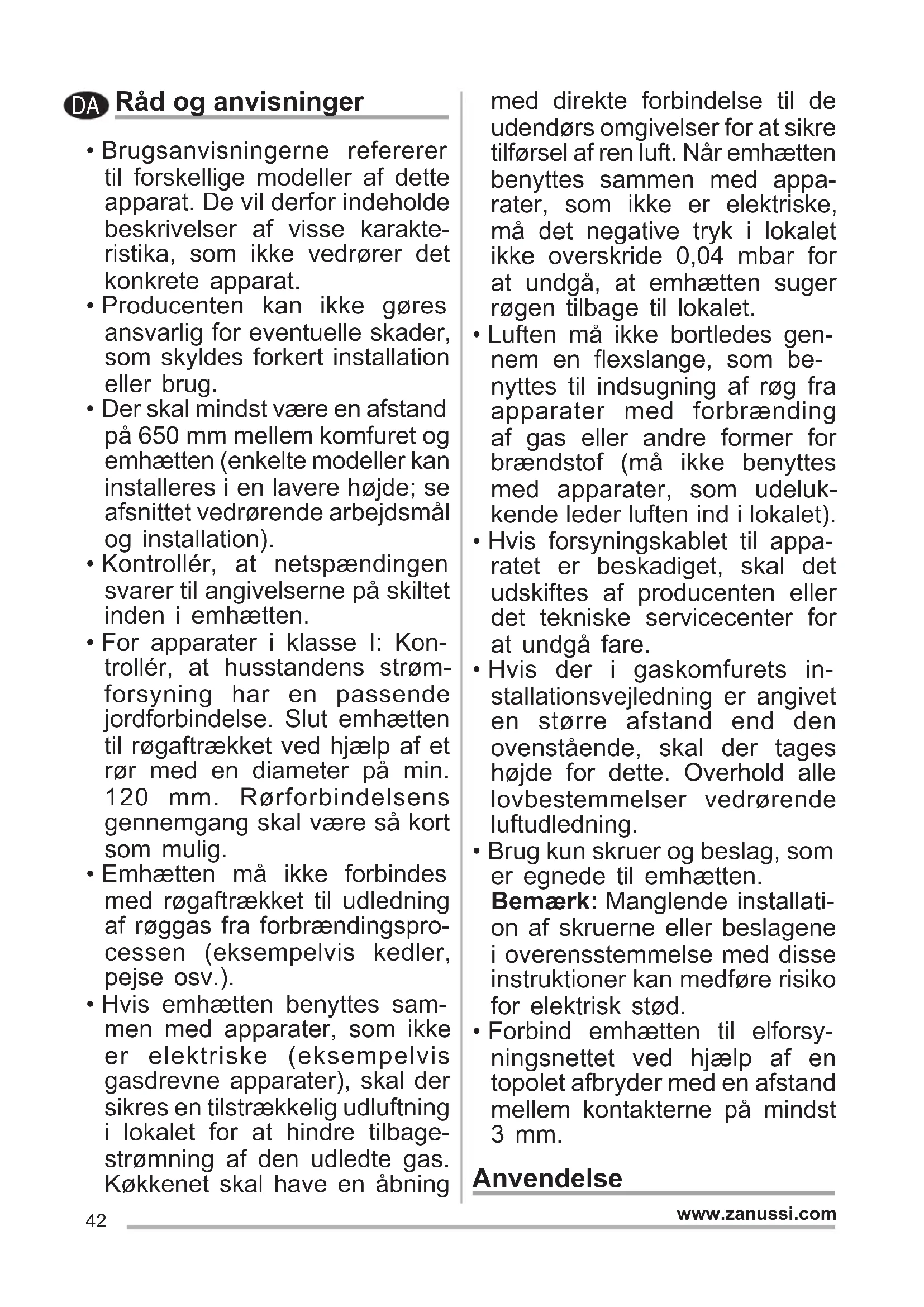- Forbind emhætten til elforsy- ningsnettet ved hjælp af en topolet afbryder med en afstand mellem kontakterne på mindst 3 mm. Anvendelse DA43 www.zanussi.com