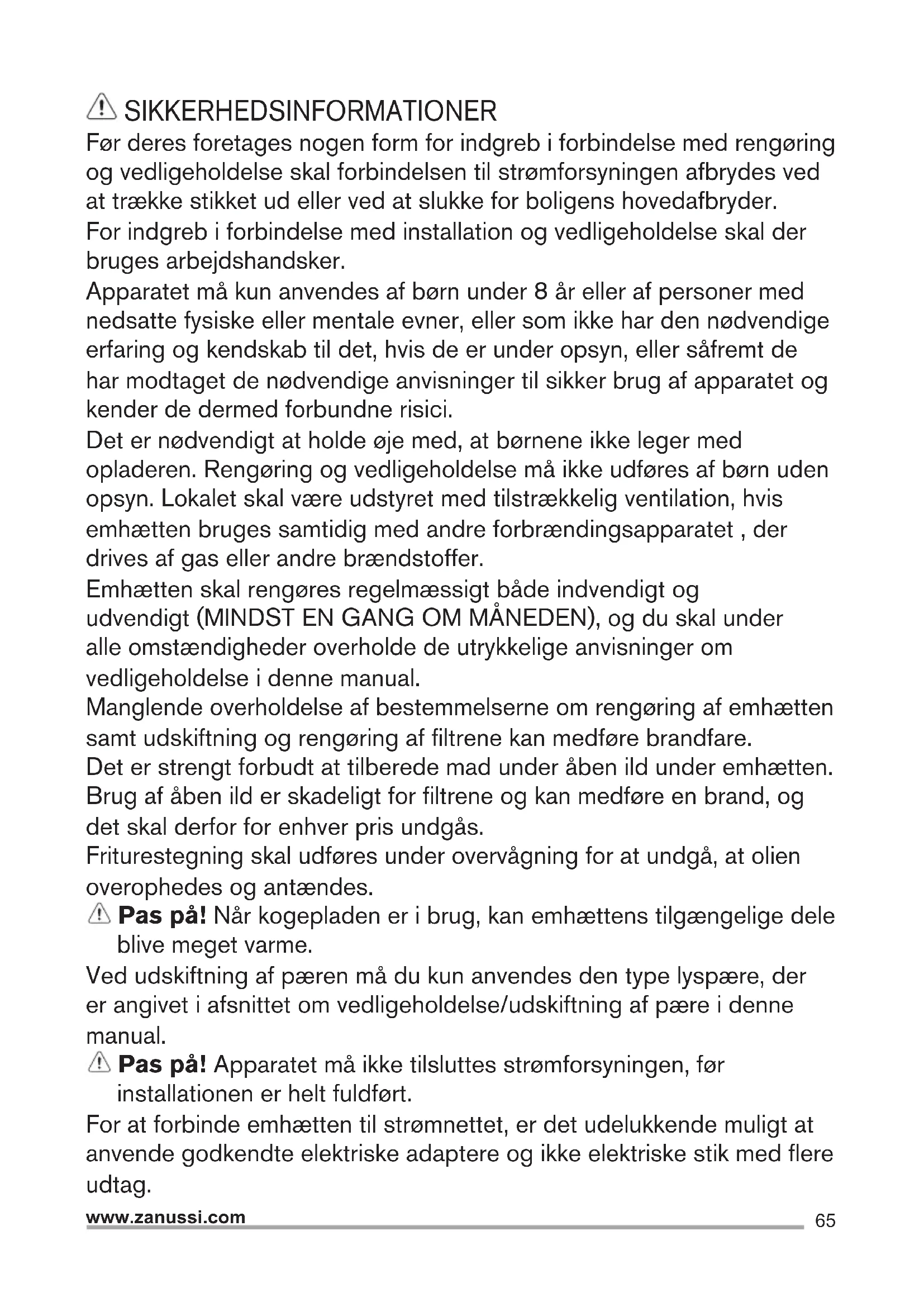 1 valojen ON/OFF katkaisija 2 moottoreiden OFF katkaisija 3 Pienin imuteho 4 keskitaso imuteho 5 korkein imuteho Käytä maksiminopeutta jos keittiössä on erityisen paljon höyryä. On suositeltavaa käynnistää tuuletus 5 minuuttia ennen ruoanlaiton aloittamista ja antaa sen toimia noin 15 minuuttia ruoanlaiton lopettamisesta. VALAISTUS Irrota laite sähköverkosta. Huomio! Tarkista että lamput eivät ole kuumia ennen kuin kosket niihin. Vaihda vaurioitunut lamppu. Käytä ainoastaan LED-lamppuja, joiden teho on enintään 2,5 W ja joiden kanta on E14. Jos haluat lisätietoja, lue liitteenä oleva lehtinen "ILCOS D" (aakkosnumeerinen sijainti on ”1e”).65 www.zanussi.com SIKKERHEDSINFORMATIONER Før deres foretages nogen form for indgreb i forbindelse med rengøring og vedligeholdelse skal forbindelsen til strømforsyningen afbrydes ved at trække stikket ud eller ved at slukke for boligens hovedafbryder. For indgreb i forbindelse med installation og vedligeholdelse skal der bruges arbejdshandsker. Apparatet må kun anvendes af børn under 8 år eller af personer med nedsatte fysiske eller mentale evner, eller som ikke har den nødvendige erfaring og kendskab til det, hvis de er under opsyn, eller såfremt de har modtaget de nødvendige anvisninger til sikker brug af apparatet og kender de dermed forbundne risici. Det er nødvendigt at holde øje med, at børnene ikke leger med opladeren. Rengøring og vedligeholdelse må ikke udføres af børn uden opsyn. Lokalet skal være udstyret med tilstrækkelig ventilation, hvis emhætten bruges samtidig med andre forbrændingsapparatet , der drives af gas eller andre brændstoffer. Emhætten skal rengøres regelmæssigt både indvendigt og udvendigt (MINDST EN GANG OM MÅNEDEN), og du skal under alle omstændigheder overholde de utrykkelige anvisninger om vedligeholdelse i denne manual. Manglende overholdelse af bestemmelserne om rengøring af emhætten samt udskiftning og rengøring af filtrene kan medføre brandfare. Det er strengt forbudt at tilberede mad under åben ild under emhætten. Brug af åben ild er skadeligt for filtrene og kan medføre en brand, og det skal derfor for enhver pris undgås. Friturestegning skal udføres under overvågning for at undgå, at olien overophedes og antændes. Pas på! Når kogepladen er i brug, kan emhættens tilgængelige dele blive meget varme. Ved udskiftning af pæren må du kun anvendes den type lyspære, der er angivet i afsnittet om vedligeholdelse/udskiftning af pære i denne manual. Pas på! Apparatet må ikke tilsluttes strømforsyningen, før installationen er helt fuldført. For at forbinde emhætten til strømnettet, er det udelukkende muligt at anvende godkendte elektriske adaptere og ikke elektriske stik med flere udtag.66 www.zanussi.com SIKKERHEDSINSTRUKTIONER Hvad angår de anviste tekniske og sikkerhedsmæssige forholdsregler til udledning af røg, skal du omhyggeligt overholde de lokale myndigheders forskrifter. Den udsugede luft må ikke tilføres en skakt, der bruges til udledning af røg fra forbrændingsapparater, der fungerer med gas eller andre brændstoffer. Du må ikke bruge eller efterlade emhætten uden korrekt monterede pærer for at undgå en risiko for elektrisk stød. Brug aldrig emhætten uden en korrekt monteret rist! Emhættens overflade må ALDRIG anvendes som afsætningsplade, med mindre dette er udtrykkeligt angivet. Brug kun de medfølgende fastspændingsskruer til produktet i forbindelse med installationen eller – såfremt de ikke medfølger – skal du indkøbe den korrekte type skruer. Brug skruer af korrekt længde, som anført i installationsvejledningen. I tvivlstilfælde bør du kontakte dit autoriserede servicecenter eller en kvalificeret tekniker. PAS PÅ! Hvis der ikke monteres de skruer og fastspændingsanordninger som angivet i disse anvisninger, kan der opstå risiko for elektriske problemer. MILJØHENSYN Genbrug materialer med symbolet . Anbring emballagematerialet i passende beholdere til genbrug. Hjælp med at beskytte miljøet og menneskelig sundhed samt at genbruge affald af elektriske og elektroniske apparater. Kasser ikke apparater, der er mærket med symbolet , sammen med husholdningsaffaldet. Lever produktet tilbage til din lokale genbrugsplads eller kontakt din kommune. ANVENDELSE Emhætten er udviklet til brug i den sugende udgave med ekstern udledning eller i den filtrerende udgave med intern recirkulation . INSTALLERING Netspændingen skal svare til spændingen vist på typeskiltet internt i emhætten. Hvis emhætten er udstyret med et stik, skal emhætten tilsluttes en let tilgængelig stikkontakt, der er i overensstemmelse med de gældende standarder. Stikkontakten skal også være let tilgængelig efter installeringen. Hvis emhætten ikke er udstyret med et stik (direkte tilslutning til elnettet), eller hvis stikket ikke findes i et område, der også er let tilgængeligt efter installeringen, skal der monteres en topolet afbryderkontakt i overensstemmelse med standarderne, der sørger for fuld afbrydelse fra elnettet i tilfælde af forhold i overspændingskategori III, og i overensstemmelse med reglerne for elektriske installationer. Obs! Undersøg altid, at netkablet er blevet monteret rigtigt, før emhættens kredsløb tilsluttes forsyningsnettet og der udføres kontrol af korrekt funktion.67 www.zanussi.com Minimumsafstanden mellem kogegrejets støtteoverflade på komfuret og den nederste del af emhætten må ikke være under 60cm ved elektriske kogeplader, og ikke under 65cm ved gasblus eller komfurer med både gasblus og elektriske kogeplader. Hvis gaskomfurets vejledning angiver en større afstand, skal dette overholdes. VEDLIGEHOLDELSE Obs! Inden der udføres nogen form for rengøring eller vedligeholdelse skal emhætten afbrydes fra elnettet ved at fjerne stikket fra stikkontakten, eller ved at afbryde hjemmets hovedafbryder. Emhætten skal rengøres jævnligt både på ydersiden og på indersiden (mindst med samme fr