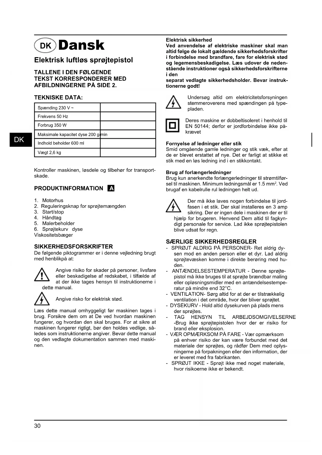 - BRUG ØJENBESKYTTELSE - Brug altid passende øjenbeskyttelse for at holde skadelige dampe borte fra øjnene. - BÆR EN MASKE - brug aldrig en sprøjtepistol uden at De bærer en sikkerhedsmaske. - BESKYT DERES ØRER - Bær høreværn hvis lyd- trykker kommer over 85dB(A). - HOLD DERES REDSKABER VEDLIG - Hold De- res sprøjtepistol, malerbeholder og dyser rene. Rens dem ikke med brændbare væsker demed en antændelsestemperatur på mindre end 32°C. Un- dersøg periodisk strømtilførslen og lad den udskifte af en fagkyndig person i tilfælde af at den er beska- diget. ÅBEN ILD - Sprøjt aldrig i nærheden af åben ild eller antændingsfl amme. - RYGNING- Ryg aldrig under sprøjtningen. - FORTYNDER - Læs altid malerfabrikantens forslag eller anvisninger om fortynding før brugen af maling ellerandre materialer. - SLÅ STRØMMEN FRA - Slå altid strømmen fra når De fylder malerbeholderen eller rengør sprøjtepi- stolen. - SLUK PISTOLEN NÅR DEN IKKE ER I BRUG -Undgå at lade pistolen være sat til at køre med reguleringsknappen for sprøjtemængden fuldstæn- digt lukket i kortere eller længere tid. Vi påtager os intet ansvar for skade forårsa- get af brug af materialer, der ikke var egnede til sprøjtepistolen, eller maling der ikke har været tyndet korrekt, eller nogen som helst helbreds- skader, der er opstået som et resultat af for dårlig ven- tilation.