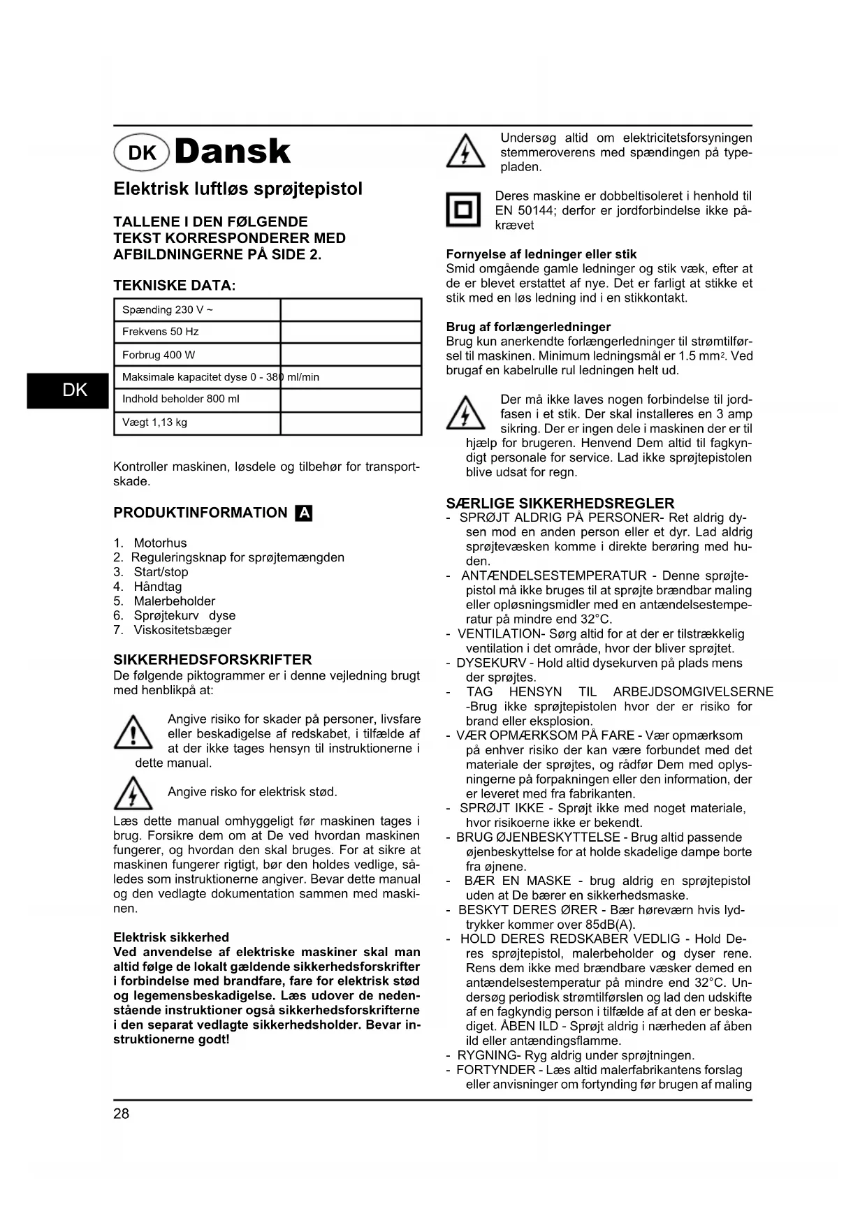 -Brug ikke sprøjtepistolen hvor der er risiko for brand eller eksplosion. - VÆR OPMÆRKSOM PÅ FARE - Vær opmærksom på enhver risiko der kan være forbundet med det materiale der sprøjtes, og rådfør Dem med oplys- ningerne på forpakningen eller den information, der er leveret med fra fabrikanten. - SPRØJT IKKE - Sprøjt ikke med noget materiale, hvor risikoerne ikke er bekendt. - BRUG ØJENBESKYTTELSE - Brug altid passende øjenbeskyttelse for at holde skadelige dampe borte fra øjnene. - BÆR EN MASKE - brug aldrig en sprøjtepistol uden at De bærer en sikkerhedsmaske. - BESKYT DERES ØRER - Bær høreværn hvis lyd- trykker kommer over 85dB(A). - HOLD DERES REDSKABER VEDLIG - Hold De- res sprøjtepistol, malerbeholder og dyser rene. Rens dem ikke med brændbare væsker demed en antændelsestemperatur på mindre end 32°C. Un- dersøg periodisk strømtilførslen og lad den udskifte af en fagkyndig person i tilfælde af at den er beska- diget. ÅBEN ILD - Sprøjt aldrig i nærheden af åben ild eller antændingsfl amme. - RYGNING- Ryg aldrig under sprøjtningen. - FORTYNDER - Læs altid malerfabrikantens forslag eller anvisninger om fortynding før brugen af maling