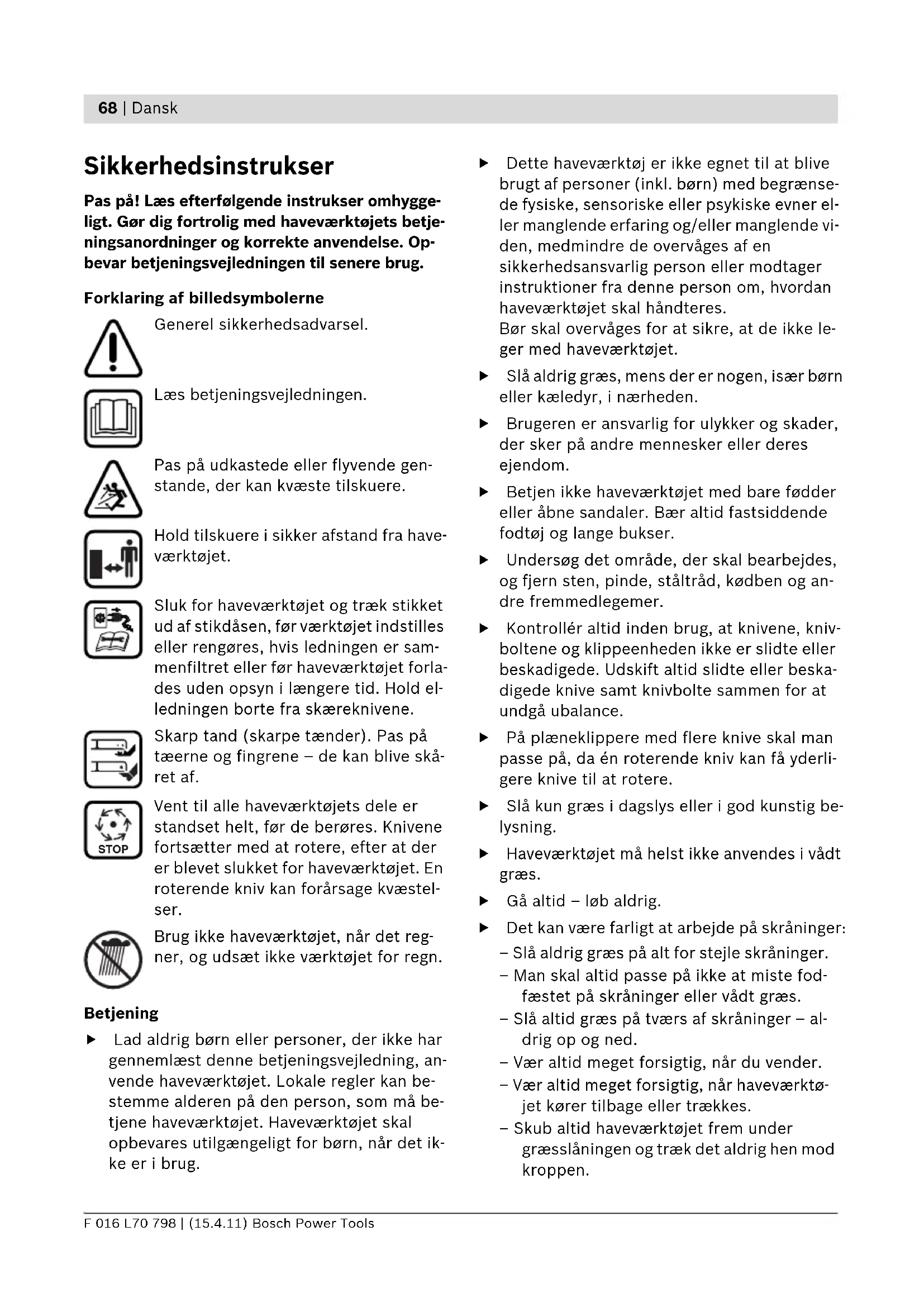 Sikkerhedsinstrukser Pas på! Læs efterfølgende instrukser omhygge- ligt. Gør dig fortrolig med haveværktøjets betje- ningsanordninger og korrekte anvendelse. Op- bevar betjeningsvejledningen til senere brug. Forklaring af billedsymbolerne Generel sikkerhedsadvarsel. Læs betjeningsvejledningen. Pas på udkastede eller flyvende gen- stande, der kan kvæste tilskuere. Hold tilskuere i sikker afstand fra have- værktøjet. Sluk for haveværktøjet og træk stikket ud af stikdåsen, før værktøjet indstilles eller rengøres, hvis ledningen er sam- menfiltret eller før haveværktøjet forla- des uden opsyn i længere tid. Hold el- ledningen borte fra skæreknivene. Skarp tand (skarpe tænder). Pas på tæerne og fingrene – de kan blive skå- ret af. Vent til alle haveværktøjets dele er standset helt, før de berøres. Knivene fortsætter med at rotere, efter at der er blevet slukket for haveværktøjet. En roterende kniv kan forårsage kvæstel- ser. Brug ikke haveværktøjet, når det reg- ner, og udsæt ikke værktøjet for regn. Betjening f Lad aldrig børn eller personer, der ikke har gennemlæst denne betjeningsvejledning, an- vende haveværktøjet. Lokale regler kan be- stemme alderen på den person, som må be- tjene haveværktøjet. Haveværktøjet skal opbevares utilgængeligt for børn, når det ik- ke er i brug. f Dette haveværktøj er ikke egnet til at blive brugt af personer (inkl. børn) med begrænse- de fysiske, sensoriske eller psykiske evner el- ler manglende erfaring og/eller manglende vi- den, medmindre de overvåges af en sikkerhedsansvarlig person eller modtager instruktioner fra denne person om, hvordan haveværktøjet skal håndteres. Bør skal overvåges for at sikre, at de ikke le- ger med haveværktøjet. f Slå aldrig græs, mens der er nogen, især børn eller kæledyr, i nærheden. f Brugeren er ansvarlig for ulykker og skader, der sker på andre mennesker eller deres ejendom. f Betjen ikke haveværktøjet med bare fødder eller åbne sandaler. Bær altid fastsiddende fodtøj og lange bukser. f Undersøg det område, der skal bearbejdes, og fjern sten, pinde, ståltråd, kødben og an- dre fremmedlegemer. f Kontrollér altid inden brug, at knivene, kniv- boltene og klippeenheden ikke er slidte eller beskadigede. Udskift altid slidte eller beska- digede knive samt knivbolte sammen for at undgå ubalance. f På plæneklippere med flere knive skal man passe på, da én roterende kniv kan få yderli- gere knive til at rotere. f Slå kun græs i dagslys eller i god kunstig be- lysning. f Haveværktøjet må helst ikke anvendes i vådt græs. f Gå altid – løb aldrig. f Det kan være farligt at arbejde på skråninger: – Slå aldrig græs på alt for stejle skråninger. – Man skal altid passe på ikke at miste fod- fæstet på skråninger eller vådt græs. – Slå altid græs på tværs af skråninger – al- drig op og ned. – Vær altid meget forsigtig, når du vender. – Vær altid meget forsigtig, når haveværktø- jet kører tilbage eller trækkes. – Skub altid haveværktøjet frem under græsslåningen og træk det aldrig hen mod kroppen. STOP OBJ_BUCH-1393-001.book Page 68 Friday, April 15, 2011 10:36 AMDansk | 69 Bosch Power Tools F 016 L70 798 | (15.4.11) f Knivene skal stå stille, når haveværktøjet vip- pes til transport, når der køres hen over an- dre overflader end græs og ved transport af haveværktøjet til og fra det område, hvor plænen skal slås. f Vip ikke haveværktøjet ved start eller når moto- ren startes, medmindre dette er nødvendigt for at starte det i højt græs. I dette tilfælde hæves den side af haveværktøjet, som vender bort fra brugeren, ved at trykke håndgrebet ned. Have- værktøjet må ikke hæves mere end nødvendigt. Sørg for, at begge hænder er på grebet, når ha- veværktøjet sænkes ned igen. f Tænd for haveværktøjet som beskrevet i betje- ningsvejledningen og sørg for, at dine fødder er tilstrækkeligt langt væk fra roterende dele. f Anbring ikke hænder eller fødder i nærheden af eller under roterende dele. f Hold afstand til udkastningszonen, når have- værktøjet kører. f Løft eller bær aldrig haveværktøjet, når mo- toren kører. f Brug aldrig haveværktøjet med defekte be- skyttelsesanordninger, afdækninger eller uden sikkerhedsudstyr som f.eks. udkast- ningsskærm og/eller græsboks. f Udfør indstillingsarbejde på plæneklipperen yderst forsigtigt for at undgå, at hænder og fødder kan komme i klemme mellem de be- vægelige knive og faststående maskindele på plæneklipperen. f Hold strøm- og forlængerledninger borte fra kniven. Kniven kan beskadige ledningerne og bringe dig i berøring med spændingsførende dele. Fare for elektrisk stød. Man skal altid tage stikket ud af stikkontakten: – før du fjerner dig fra haveværktøjet, – inden man fjerner en blokering, – før du kontrollerer, rengør eller arbejder på haveværktøjet, – efter at man har ramt et fremmedlegeme. Kontroller straks haveværktøjet for beskadi- gelser og få det repareret, hvis det er nødven- digt, – hvis haveværktøjet begynder at vibrere unor- malt meget (kontrollér omgående). Strømtilslutning f Strømkildens spænding skal stemme over- ens med angivelserne på haveværktøjets ty- peskilt. f Det anbefales, at dette haveværktøj kun til- sluttes til en stikdåse, der er sikret med en afbrydelsesstrøm på 30 mA. f Brug eller erstat kun nettilslutningsledninger på dette haveværktøj, der stemmer overens med fabrikantens oplysninger; best.nr. og ty- pe se driftsvejledning. f Tag aldrig fat omkring netstikket med våde hænder. f Kør ikke hen over ledningen eller forlænger- ledningen, mas dem ikke og træk ikke i dem, da de kan blive beskadiget. Beskyt ledningen mod varme, olie og skarpe kanter. f Forlængerledningen skal være stænkvands- beskyttet og have det tværsnit, der er angivet i betjeningsvejledningen. Stikforbindelsen må ikke ligge i vand. f Brug al