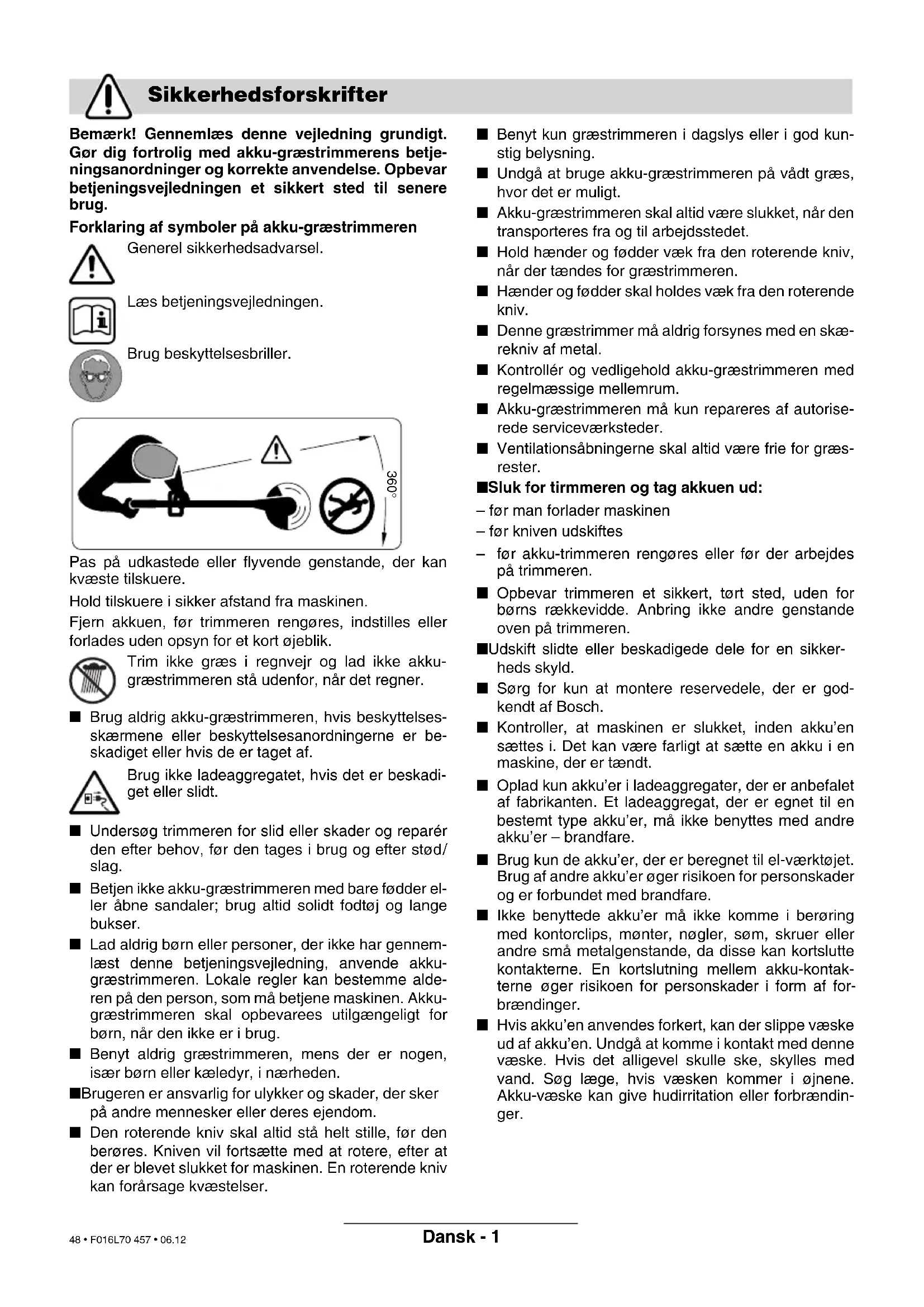 Wijzigingen voorbehouden Afvalverwijdering Klantenservice Conformiteitsverklaring F016L70 457.book Seite 6 Montag, 18. Dezember 2006 9:45 09 47 • F016L70 457 • 06.12Dansk - 1 Bemærk! Gennemlæs denne vejledning grundigt. Gør dig fortrolig med akku-græstrimmerens betje- ningsanordninger og korrekte anvendelse. Opbevar betjeningsvejledningen et sikkert sted til senere brug. Forklaring af symboler på akku-græstrimmeren Generel sikkerhedsadvarsel. Læs betjeningsvejledningen. Brug beskyttelsesbriller. Pas på udkastede eller flyvende genstande, der kan kvæste tilskuere. Hold tilskuere i sikker afstand fra maskinen. Fjern akkuen, før trimmeren rengøres, indstilles eller forlades uden opsyn for et kort øjeblik. Trim ikke græs i regnvejr og lad ikke akku- græstrimmeren stå udenfor, når det regner. ■ Brug aldrig akku-græstrimmeren, hvis beskyttelses- skærmene eller beskyttelsesanordningerne er be- skadiget eller hvis de er taget af. Brug ikke ladeaggregatet, hvis det er beskadi- get eller slidt. ■ Undersøg trimmeren for slid eller skader og reparér den efter behov, før den tages i brug og efter stød/ slag. ■ Betjen ikke akku-græstrimmeren med bare fødder el- ler åbne sandaler; brug altid solidt fodtøj og lange bukser. ■ Lad aldrig børn eller personer, der ikke har gennem- læst denne betjeningsvejledning, anvende akku- græstrimmeren. Lokale regler kan bestemme alde- ren på den person, som må betjene maskinen. Akku- græstrimmeren skal opbevarees utilgængeligt for børn, når den ikke er i brug. ■ Benyt aldrig græstrimmeren, mens der er nogen, især børn eller kæledyr, i nærheden. ■ Brugeren er ansvarlig for ulykker og skader, der sker på andre mennesker eller deres ejendom. ■ Den roterende kniv skal altid stå helt stille, før den berøres. Kniven vil fortsætte med at rotere, efter at der er blevet slukket for maskinen. En roterende kniv kan forårsage kvæstelser. ■ Benyt kun græstrimmeren i dagslys eller i god kun- stig belysning. ■ Undgå at bruge akku-græstrimmeren på vådt græs, hvor det er muligt. ■ Akku-græstrimmeren skal altid være slukket, når den transporteres fra og til arbejdsstedet. ■ Hold hænder og fødder væk fra den roterende kniv, når der tændes for græstrimmeren. ■ Hænder og fødder skal holdes væk fra den roterende kniv. ■ Denne græstrimmer må aldrig forsynes med en skæ- rekniv af metal. ■ Kontrollér og vedligehold akku-græstrimmeren med regelmæssige mellemrum. ■ Akku-græstrimmeren må kun repareres af autorise- rede serviceværksteder. ■ Ventilationsåbningerne skal altid være frie for græs- rester. ■ Sluk for tirmmeren og tag akkuen ud: – før man forlader maskinen – før kniven udskiftes – før akku-trimmeren rengøres eller før der arbejdes på trimmeren. ■ Opbevar trimmeren et sikkert, tørt sted, uden for børns rækkevidde. Anbring ikke andre genstande oven på trimmeren. ■ Udskift slidte eller beskadigede dele for en sikker- heds skyld. ■ Sørg for kun at montere reservedele, der er god- kendt af Bosch. ■ Kontroller, at maskinen er slukket, inden akku’en sættes i. Det kan være farligt at sætte en akku i en maskine, der er tændt. ■ Oplad kun akku’er i ladeaggregater, der er anbefalet af fabrikanten. Et ladeaggregat, der er egnet til en bestemt type akku’er, må ikke benyttes med andre akku’er – brandfare. ■ Brug kun de akku’er, der er beregnet til el-værktøjet. Brug af andre akku’er øger risikoen for personskader og er forbundet med brandfare. ■ Ikke benyttede akku’er må ikke komme i berøring med kontorclips, mønter, nøgler, søm, skruer eller andre små metalgenstande, da disse kan kortslutte kontakterne. En kortslutning mellem akku-kontak- terne øger risikoen for personskader i form af for- brændinger. ■ Hvis akku’en anvendes forkert, kan der slippe væske ud af akku’en. Undgå at komme i kontakt med denne væske. Hvis det alligevel skulle ske, skylles med vand. Søg læge, hvis væsken kommer i øjnene. Akku-væske kan give hudirritation eller forbrændin- ger. Sikkerhedsforskrifter 360° F016L70 457.book Seite 1 Montag, 18. Dezember 2006 9:45 09 48 • F016L70 457 • 06.12Dansk - 2 Dette produkt er beregnet til at klippe græs og fjerne ukrudt under buske samt på skråninger, skrænter og langs kanter, hvor det ikke er muligt at benytte plæ- neklipperen. Den beregnede anvendelse gælder omgivelsestem- peraturer mellem 0 °C og 40 °C. Denne vejledning giver instruktioner om den kor- rekte samling og sikre anvendelse af græstrimme- ren. Det er vigtigt at gennemlæse disse instruktioner omhyggeligt. Akku-græstrimmeren tages forsigtigt ud af emballa- gen. Kontrollér herefter at der ikke mangler nogle af delene: – Trimmer – Beskyttelseskappe – Skæreskive – Skærekniv – Ladeaggregat – Betjeningsvejledning Hvis nogle dele mangler eller er beskadigede, bedes du kontakte den forhandler, hvor du har købt maskinen. 1 Start-stop-kontakt 2 Greb 3 Styregreb 4 Overdel på skaft 5 Underdel på skaft 6 Trimmerhoved 7 Ventilationsåbninger 8 Beskyttelsesskærm 9 Akku 10 Ladeaggregat 11 Akku-ladeskakt 12 Kontrollampe 13 El-stik** 14 Serienummer **landsspecifk Tilbehør, som er illustreret og beskrevet i betjenings- vejledningen, er ikke altid indeholdt i leveringen. Tekniske data Akku-græstrimmer ART 23 EASYTRIM ACCU/
