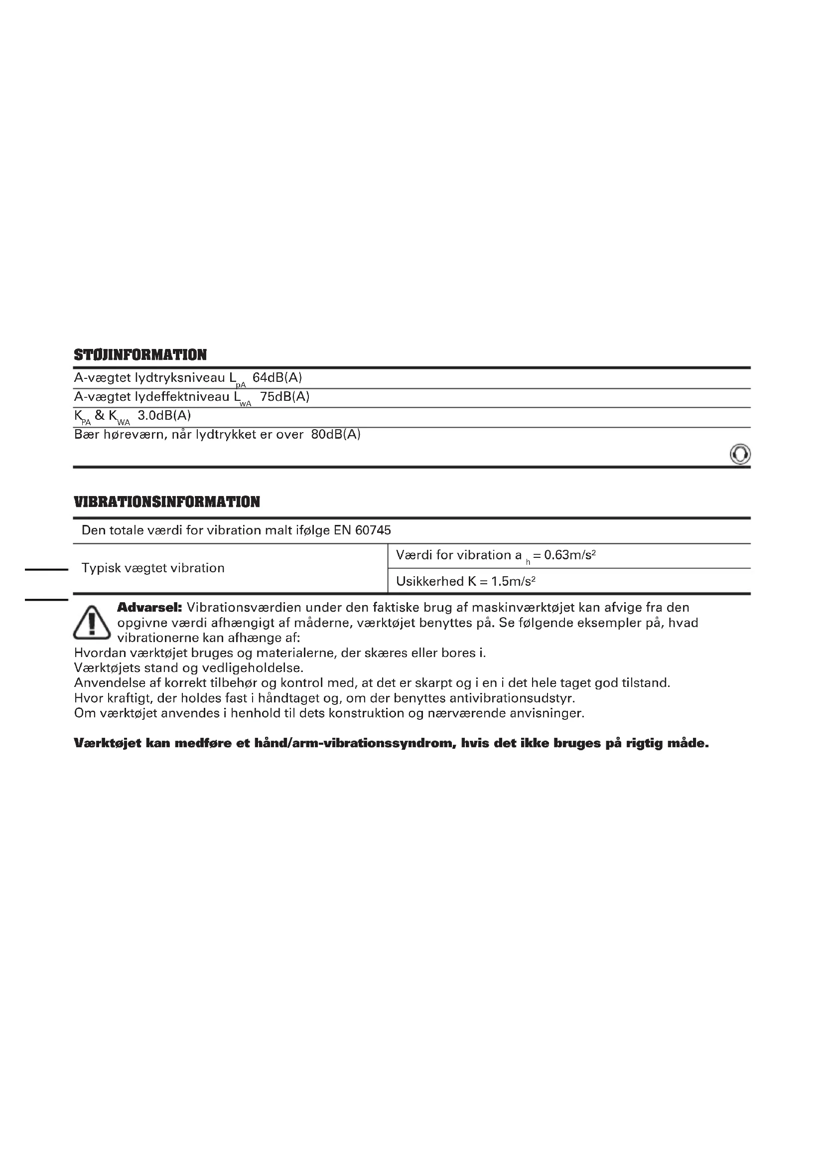 = 0.63m/s² Usikkerhed K = 1.5m/s² Advarsel: Vibrationsværdien under den faktiske brug af maskinværktøjet kan afvige fra den opgivne værdi afhængigt af måderne, værktøjet benyttes på. Se følgende eksempler på, hvad vibrationerne kan afhænge af: Hvordan værktøjet bruges og materialerne, der skæres eller bores i. Værktøjets stand og vedligeholdelse. Anvendelse af korrekt tilbehør og kontrol med, at det er skarpt og i en i det hele taget god tilstand. Hvor kraftigt, der holdes fast i håndtaget og, om der benyttes antivibrationsudstyr. Om værktøjet anvendes i henhold til dets konstruktion og nærværende anvisninger. Værktøjet kan medføre et hånd/arm-vibrationssyndrom, hvis det ikke bruges på rigtig måde. A-vægtet lydtryksniveau L
