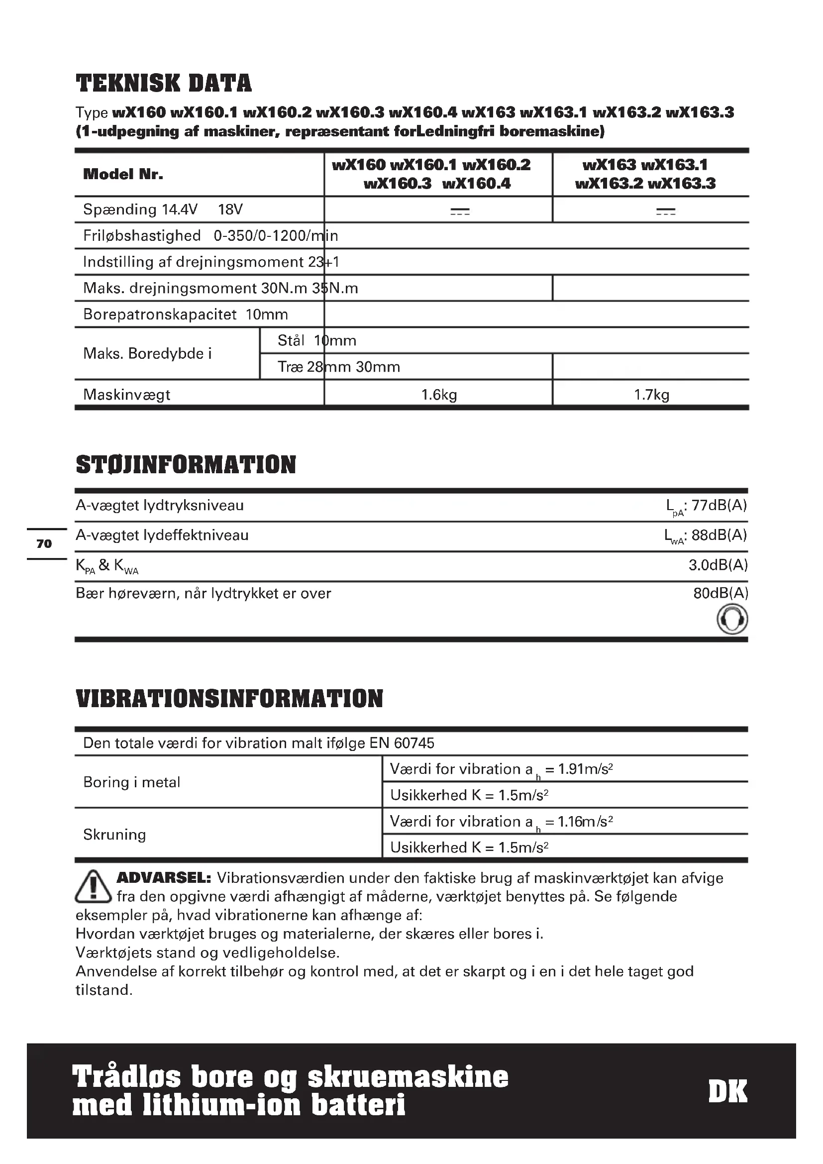 = 1.16m /s² Usikkerhed K = 1.5m/s² ADVARSEL: Vibrationsværdien under den faktiske brug af maskinværktøjet kan afvige fra den opgivne værdi afhængigt af måderne, værktøjet benyttes på. Se følgende eksempler på, hvad vibrationerne kan afhænge af: Hvordan værktøjet bruges og materialerne, der skæres eller bores i. Værktøjets stand og vedligeholdelse. Anvendelse af korrekt tilbehør og kontrol med, at det er skarpt og i en i det hele taget god tilstand.71 Trådløs bore og skruemaskine med lithium-ion batteri