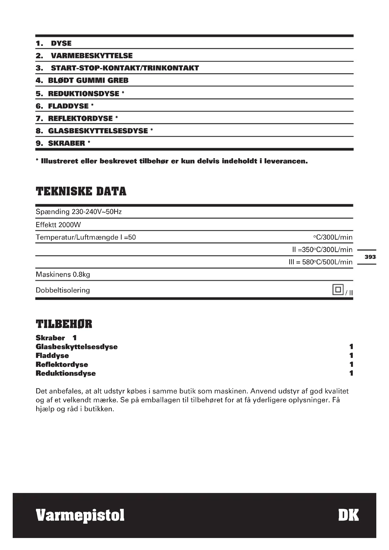 - Illustreret eller beskrevet tilbehør er kun delvis indeholdt i leverancen. TEKNISKE DATA Spænding 230-240V~50Hz Effektt 2000W Temperatur/Luftmængde I =50