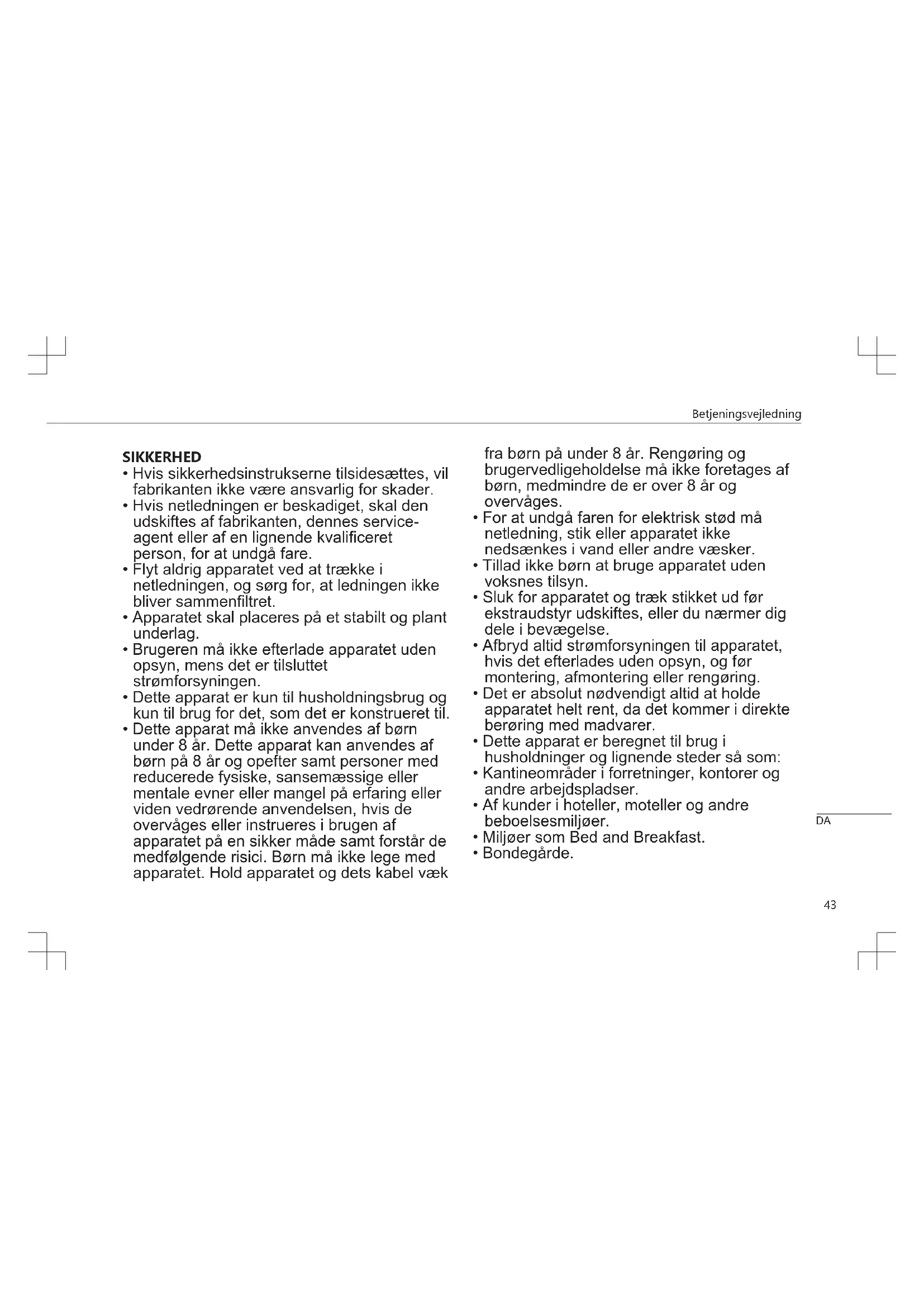 - Dette apparat må ikke anvendes af børn under 8 år. Dette apparat kan anvendes af børn på 8 år og opefter samt personer med reducerede fysiske, sansemæssige eller mentale evner eller mangel på erfaring eller viden vedrørende anvendelsen, hvis de overvåges eller instrueres i brugen af apparatet på en sikker måde samt forstår de medfølgende risici. Børn må ikke lege med apparatet. Hold apparatet og dets kabel væk fra børn på under 8 år. Rengøring og brugervedligeholdelse må ikke foretages af børn, medmindre de er over 8 år og overvåges.