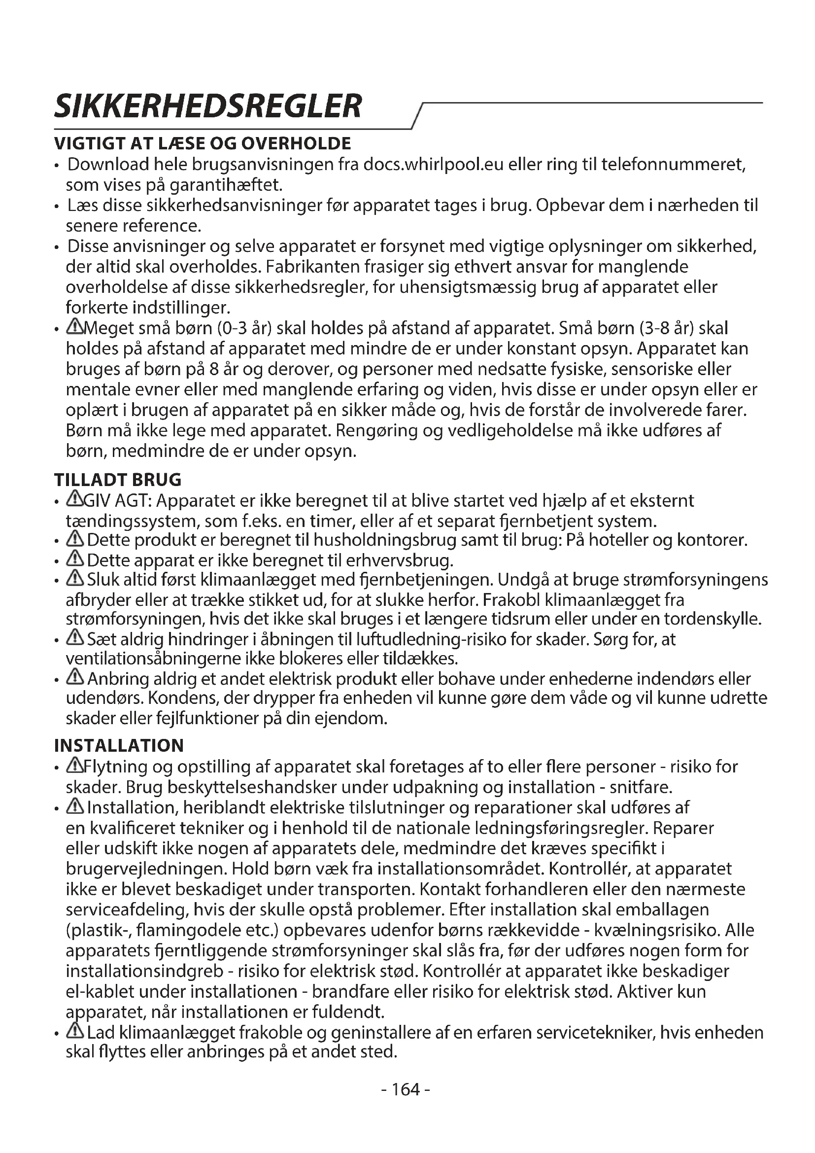 Lad klimaanlægget frakoble og geninstallere af en erfaren servicetekniker, hvis enheden skal yttes eller anbringes på et andet sted. SIKKERHEDSREGLER- 165 -
