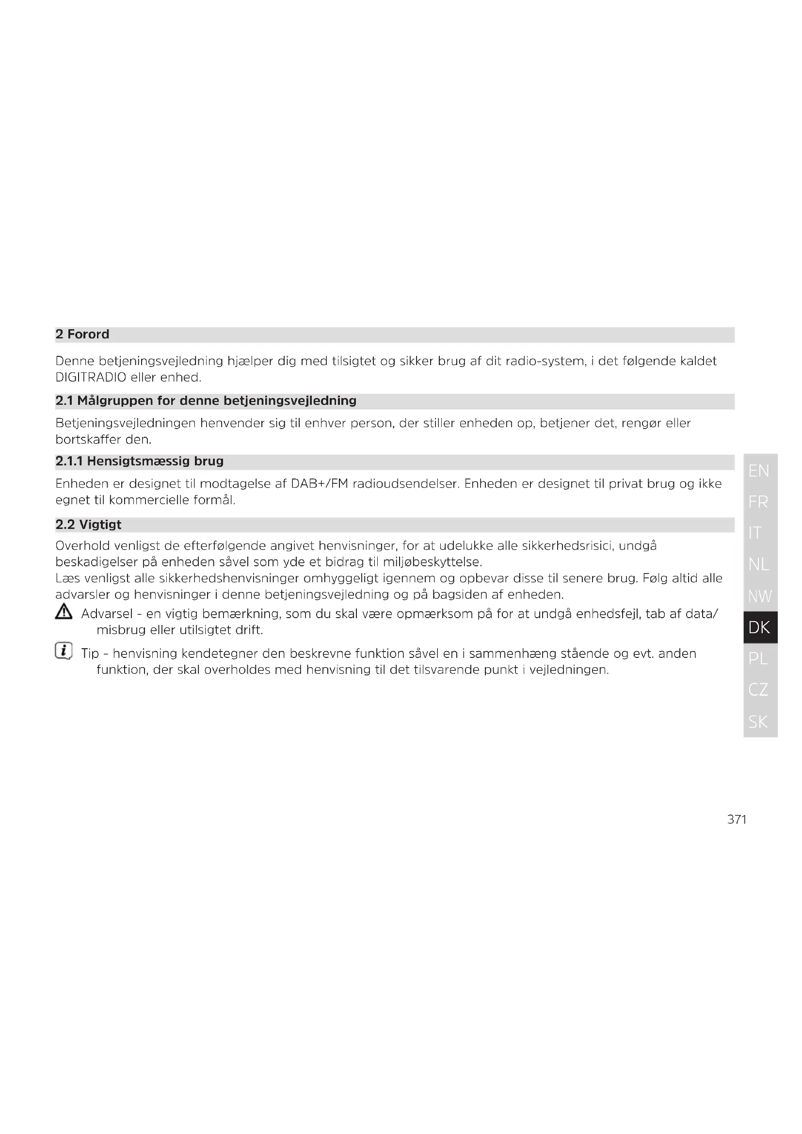 2 Forord Denne betjeningsvejledning hjælper dig med tilsigtet og sikker brug af dit radio-system, i det følgende kaldet DIGITRADIO eller enhed.
