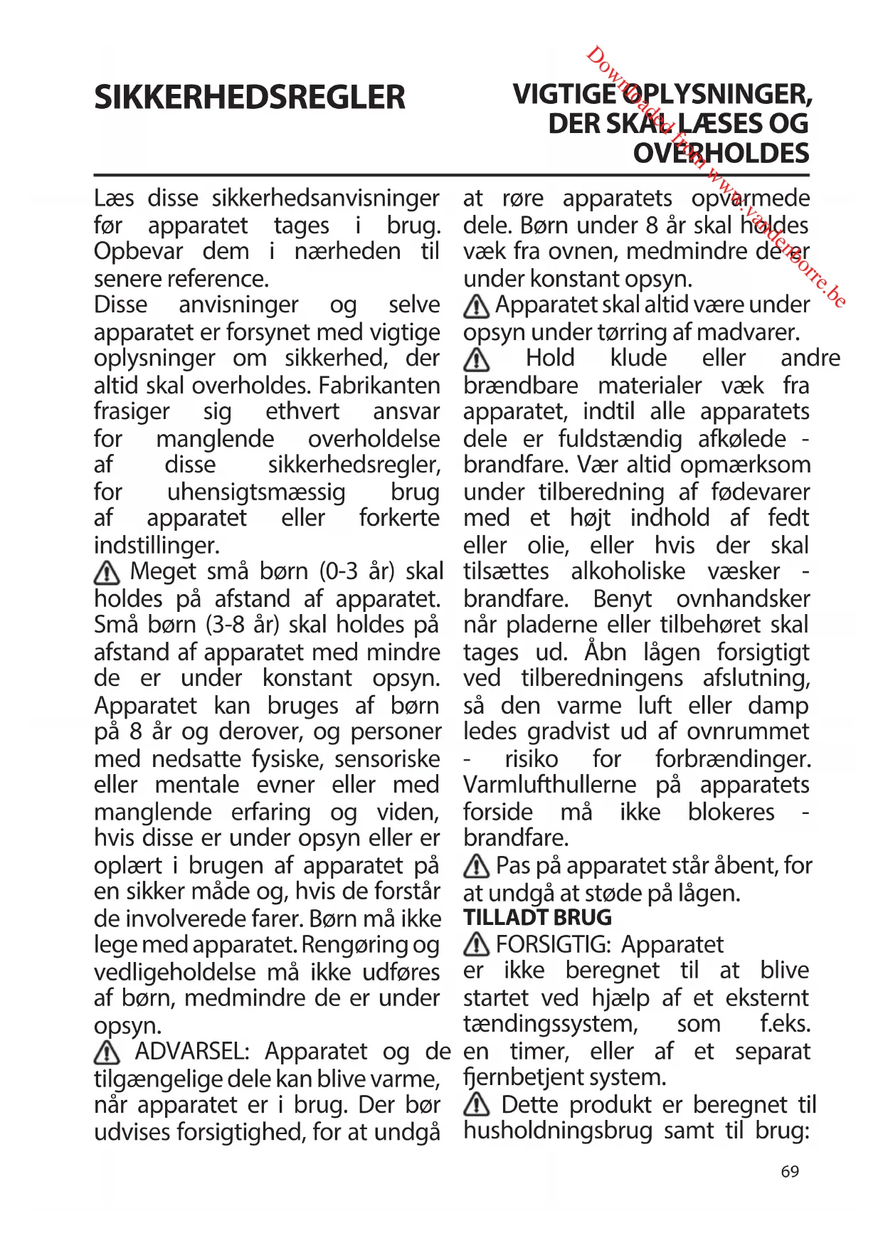 ⚠ ADVARSEL: Apparatet og de tilgængelige dele kan blive varme, när apparatet er i brug. Der bør udvises forsigtighed, for at undgå at røre apparatets opvarmede dele. Børn under 8 år skal håldes væk fra ovnen, medmindre deer under konstant opsyn.