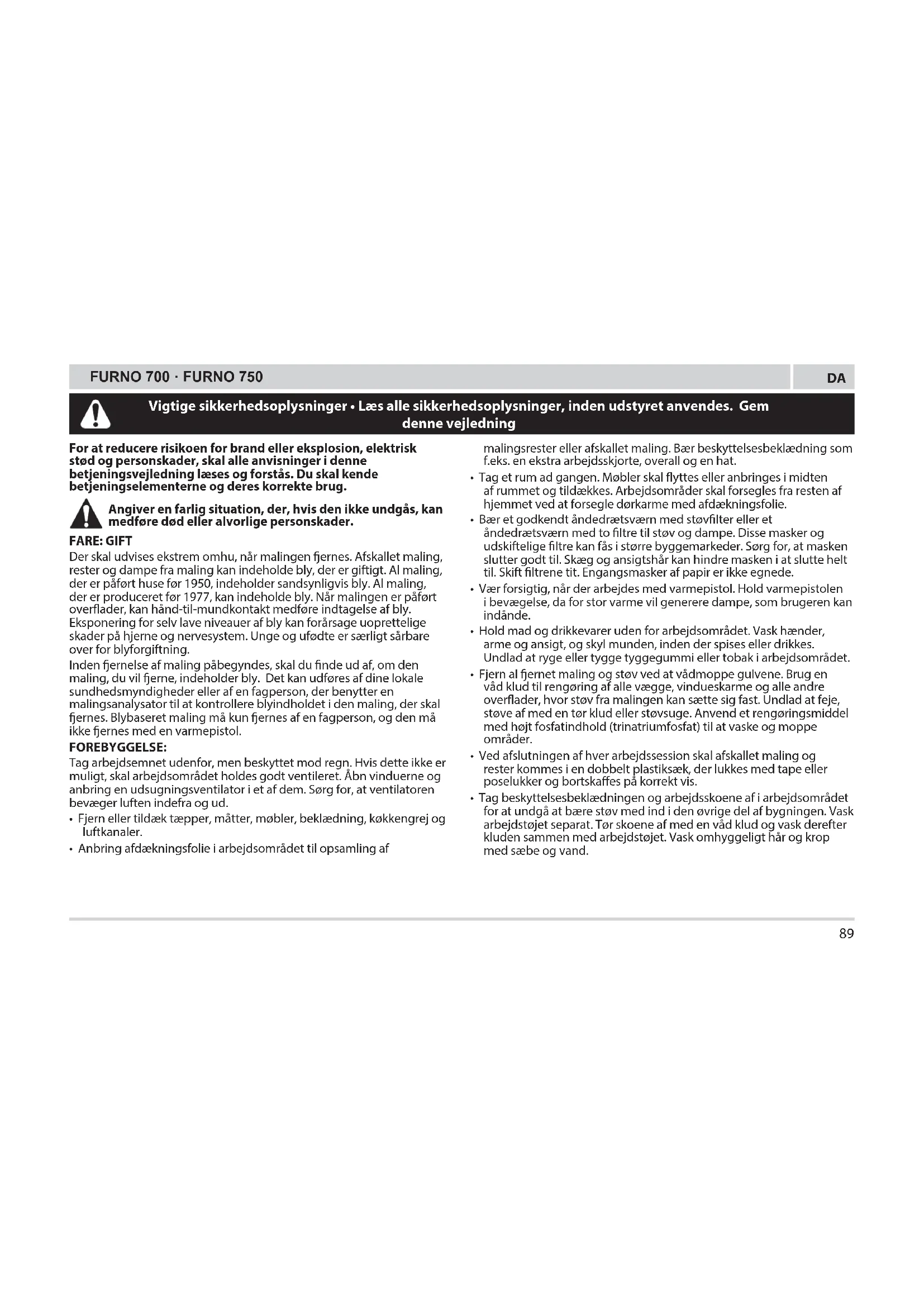 For at reducere risikoen for brand eller eksplosion, elektrisk stød og personskader, skal alle anvisninger i denne betjeningsvejledning læses og forstås. Du skal kende betjeningselementerne og deres korrekte brug. Angiver en farlig situation, der, hvis den ikke undgås, kan medføre død eller alvorlige personskader. FARE: GIFT Der skal udvises ekstrem omhu, når malingen ernes. Afskallet maling, rester og dampe fra maling kan indeholde bly, der er giftigt. Al maling, der er påført huse før 1950, indeholder sandsynligvis bly. Al maling, der er produceret før 1977, kan indeholde bly. Når malingen er påført overader, kan hånd-til-mundkontakt medføre indtagelse af bly. Eksponering for selv lave niveauer af bly kan forårsage uoprettelige skader på hjerne og nervesystem. Unge og ufødte er særligt sårbare over for blyforgiftning. Inden ernelse af maling påbegyndes, skal du nde ud af, om den maling, du vil erne, indeholder bly. Det kan udføres af dine lokale sundhedsmyndigheder eller af en fagperson, der benytter en malingsanalysator til at kontrollere blyindholdet i den maling, der skal ernes. Blybaseret maling må kun ernes af en fagperson, og den må ikke ernes med en varmepistol. FOREBYGGELSE: Tag arbejdsemnet udenfor, men beskyttet mod regn. Hvis dette ikke er muligt, skal arbejdsområdet holdes godt ventileret. Åbn vinduerne og anbring en udsugningsventilator i et af dem. Sørg for, at ventilatoren bevæger luften indefra og ud.