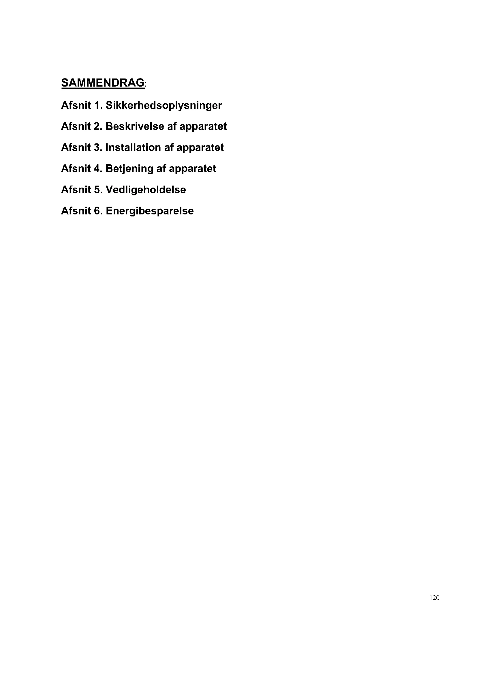 Με την τοποθέτηση της σήμανσης σε αυτή τη συσκευή, πιστοποιούμε τη συμμόρφωση με όλες τις σχετικές ευρωπαϊκές απαιτήσεις ασφάλειας, υγείας και περιβάλλοντος που ισχύουν στη νομοθεσία για αυτό το προϊόν.120 SAMMENDRAG: Afsnit 1. Sikkerhedsoplysninger Afsnit 2. Beskrivelse af apparatet Afsnit 3. Installation af apparatet Afsnit 4. Betjening af apparatet Afsnit 5. Vedligeholdelse Afsnit 6. Energibesparelse121 Tak for dit køb af dette produkt. Før du benytter dit køleskab, bedes du læse denne betjeningsvejledning for at få mest ud af dets ydeevne. Gem alle dokumenter til senere brug eller andre ejere. Dette produkt er udelukkende beregnet til husholdningsbrud eller lignende anvendelser såsom: køkkenområdet for personale i forretninger, kontorer og andre arbejdsmiljøer på gårde, af klientel på hoteller, moteller og andre beboelsesmiljøer på bed and breakfast (B & B) til cateringservice og lignende anvendelser, som ikke er detailhandel. Dette apparat må udelukkende benyttes til opbevaring af fødevarer. Alle andre anvendelser betragtes som farlige, og producenten vil ikke stå til ansvar for udeladelser. Det anbefales desuden, at du bemærker garantibetingelserne.122 Afsnit 1. Sikkerhedsoplysninger Denne vejledning indeholder en række vigtige sikkerhedsoplysninger. Opbevar disse instruktioner på et sikkert sted, så du nemt kan høre dem, mens du bruger apparatet. Køleskabet indeholder en kølemiddel gas (isobutan, R600a) og en isolations gas (cyclopentan); Begge gasser er meget kompatible med miljøet, men er brandfarlige Varoitus: palo vaara Jos jäähdytys piiri on näkyvästi vaurioitunut: Vältä läheisyys avotulen ja sytytys lähteiden avulla. Huolellisesti tuuletusta ympäristön, jossa laite on asennettu ADVARSEL! Køleskabet indeholder en kølegas (R600a: isobuten) og en isoleringsgas (cyklopentan), som har en høj forenelighed med miljøet, men som dog er brændbare. Vi anbefaler, at du følger de følgende regulativer for at undgå farlige situationer: