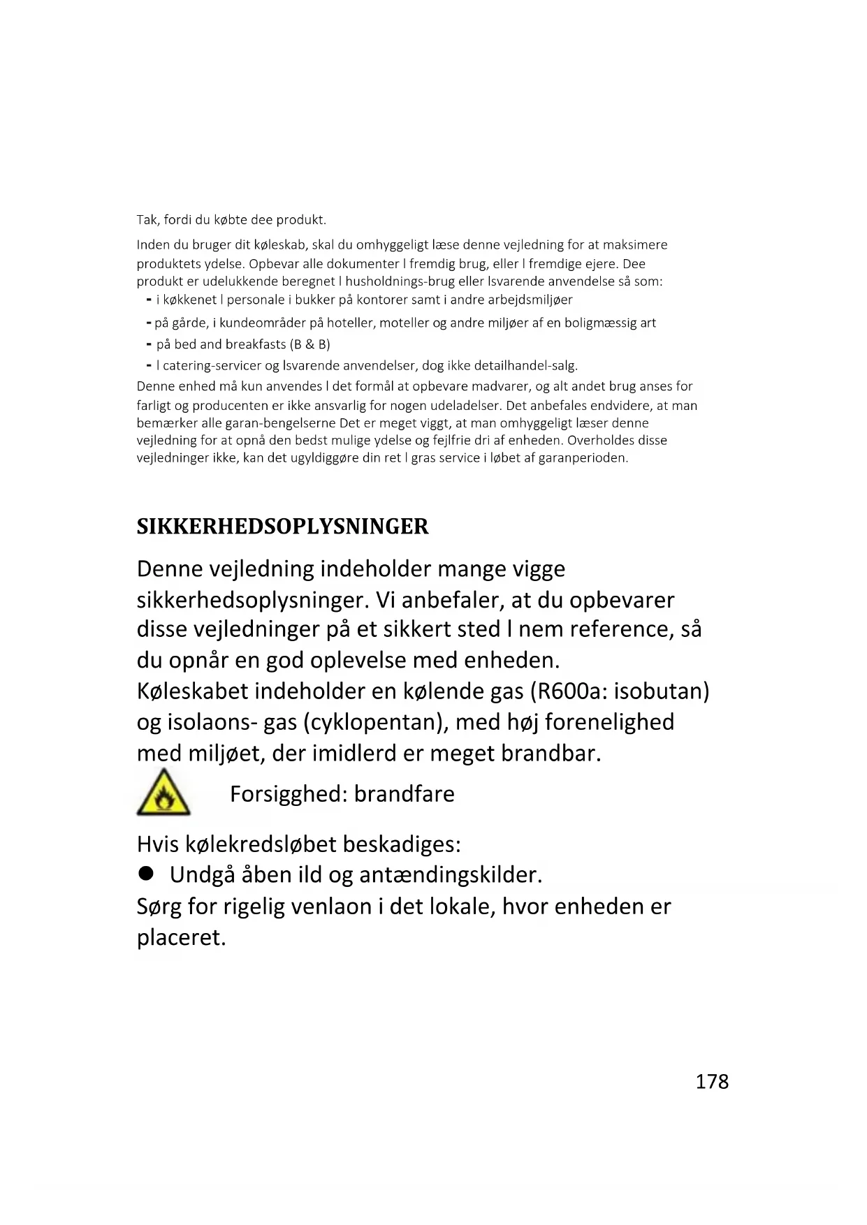 Denne vejledning indeholder mange vigge sikkerhedsoplysninger. Vi anbefaler, at du opbevarer disse vejledninger på et sikkert sted l nem reference, så du opnår en god oplevelse med enheden. Køleskabet indeholder en kølende gas (R600a: isobutan) og isolaons- gas (cyklopentan), med høj forenelighed med miljøet, der imidlerd er meget brandbar.