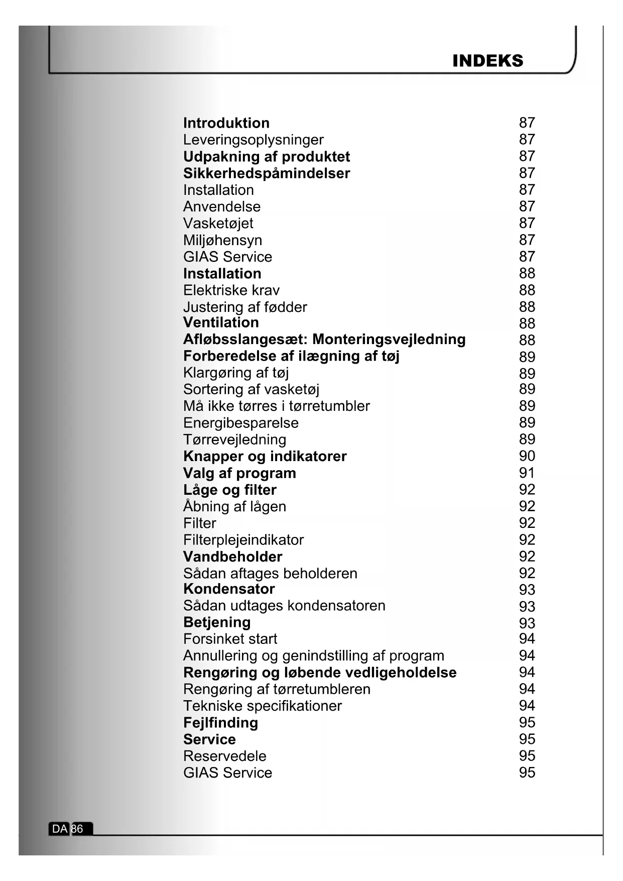 85Introduktion Leveringsoplysninger Udpakning af produktet Sikkerhedspåmindelser Installation Anvendelse Vasketøjet Miljøhensyn GIAS Service Installation Elektriske krav Justering af fødder Ventilation Afløbsslangesæt: Monteringsvejledning Forberedelse af ilægning af tøj Klargøring af tøj Sortering af vasketøj Må ikke tørres i tørretumbler Energibesparelse Tørrevejledning Knapper og indikatorer Valg af program Låge og filter Åbning af lågen Filter Filterplejeindikator Vandbeholder Sådan aftages beholderen Kondensator Sådan udtages kondensatoren Betjening Forsinket start Annullering og genindstilling af program Rengøring og løbende vedligeholdelse Rengøring af tørretumbleren Tekniske specifikationer Fejlfinding Service Reservedele GIAS Service INDEKS