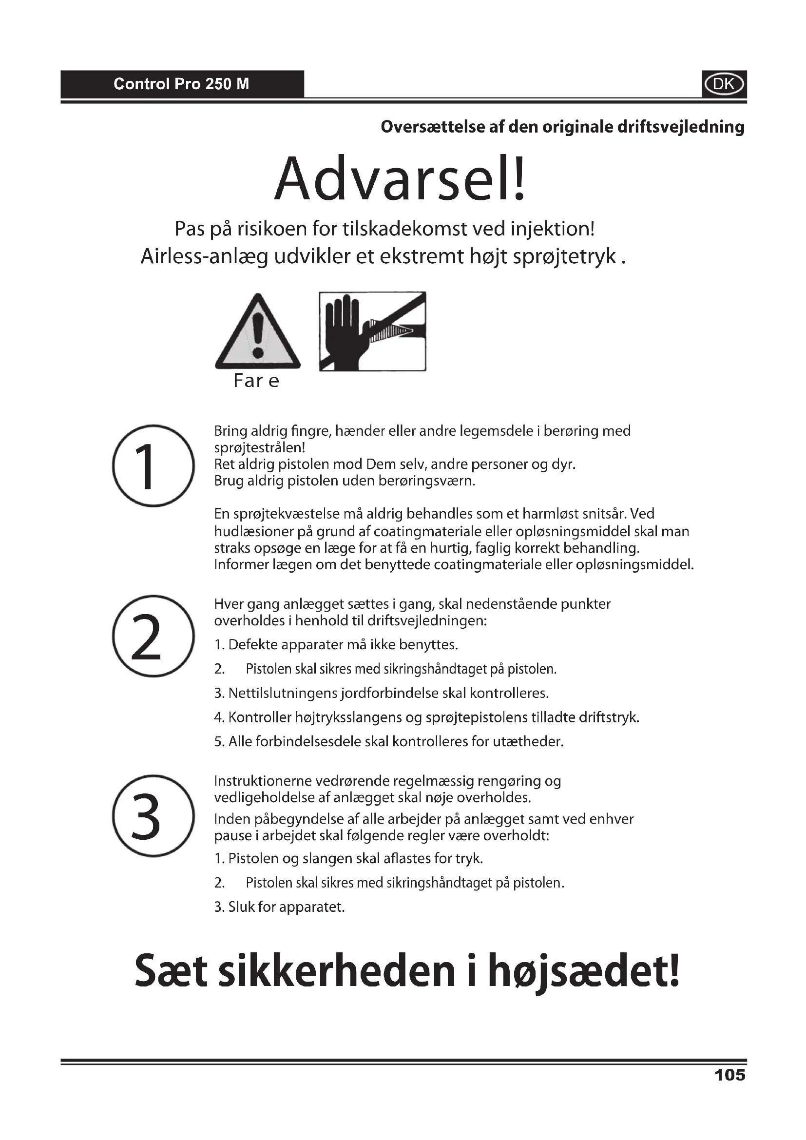 Sætsikkerhedenihøjsædet! Pas på risikoen for tilskadekomst ved injektion! Airless-anlæg udvikler et ekstremt højt sprøjtetryk . Far e