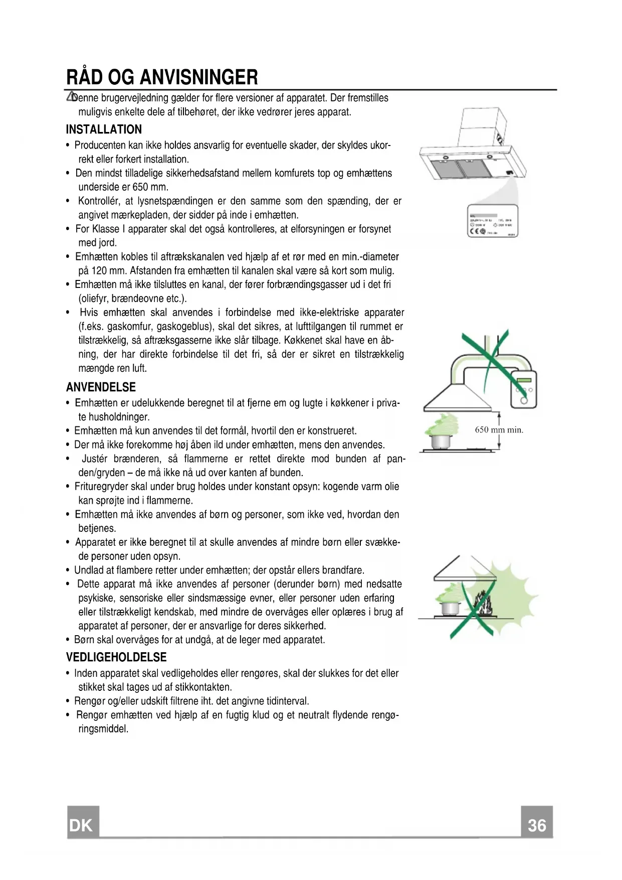 - Rengør emhætten ved hjælp af en fugtig klud og et neutralt flydende rengø- ringsmiddel. 650 mm min.DK