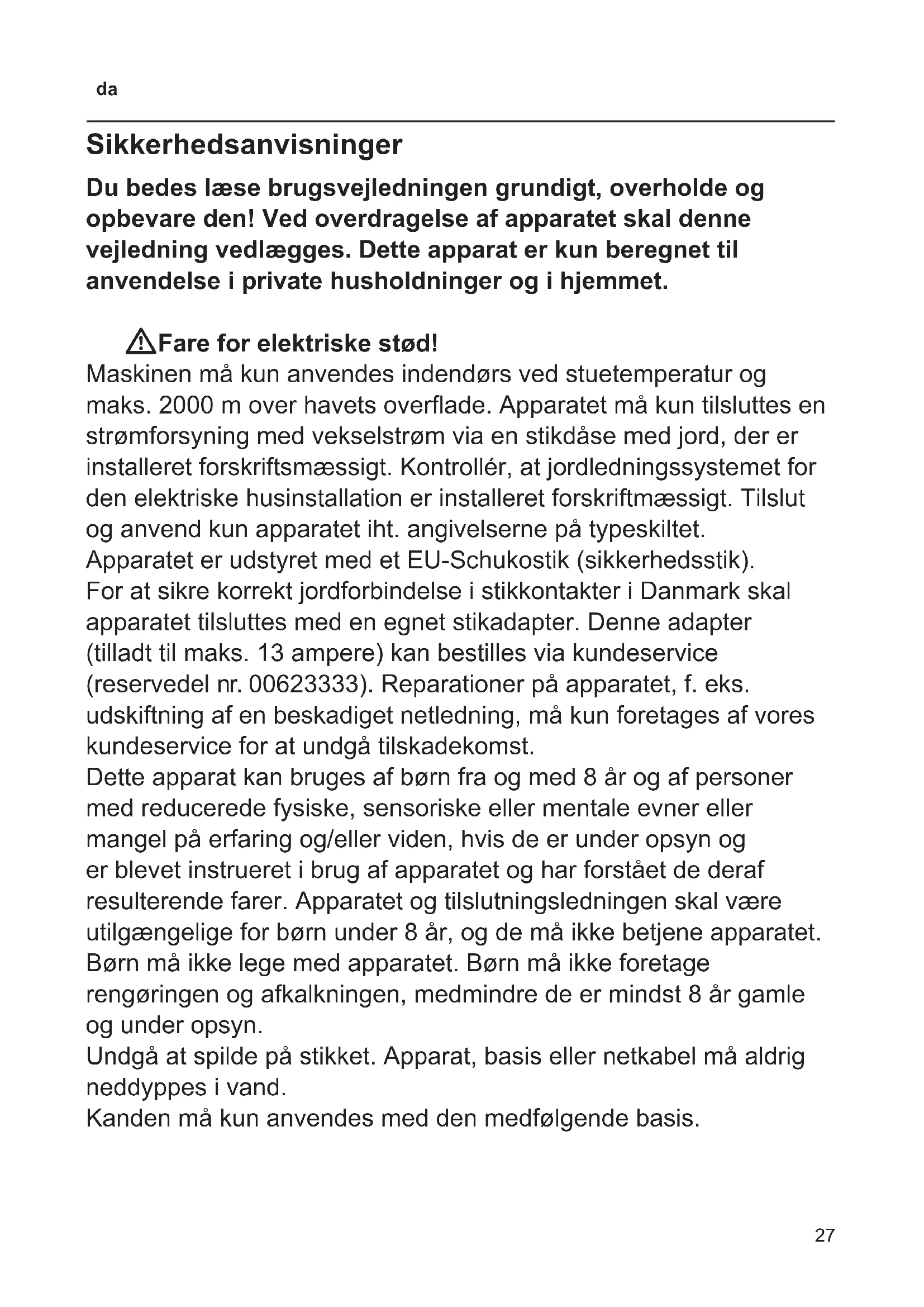 Sikkerhedsanvisninger Du bedes læse brugsvejledningen grundigt, overholde og opbevare den! Ved overdragelse af apparatet skal denne vejledning vedlægges. Dette apparat er kun beregnet til anvendelse i private husholdninger og i hjemmet. WFare for elektriske stød! Maskinen må kun anvendes indendørs ved stuetemperatur og maks. 2000 m over havets overade. Apparatet må kun tilsluttes en strømforsyning med vekselstrøm via en stikdåse med jord, der er installeret forskriftsmæssigt. Kontrollér, at jordledningssystemet for den elektriske husinstallation er installeret forskriftmæssigt. Tilslut og anvend kun apparatet iht. angivelserne på typeskiltet. Apparatet er udstyret med et EU-Schukostik (sikkerhedsstik). For at sikre korrekt jordforbindelse i stikkontakter i Danmark skal apparatet tilsluttes med en egnet stikadapter. Denne adapter (tilladt til maks. 13 ampere) kan bestilles via kundeservice (reservedel nr. 00623333). Reparationer på apparatet, f. eks. udskiftning af en beskadiget netledning, må kun foretages af vores kundeservice for at undgå tilskadekomst. Dette apparat kan bruges af børn fra og med 8 år og af personer med reducerede fysiske, sensoriske eller mentale evner eller mangel på erfaring og/eller viden, hvis de er under opsyn og er blevet instrueret i brug af apparatet og har forstået de deraf resulterende farer. Apparatet og tilslutningsledningen skal være utilgængelige for børn under 8 år, og de må ikke betjene apparatet. Børn må ikke lege med apparatet. Børn må ikke foretage rengøringen og afkalkningen, medmindre de er mindst 8 år gamle og under opsyn. Undgå at spilde på stikket. Apparat, basis eller netkabel må aldrig neddyppes i vand. Kanden må kun anvendes med den medfølgende basis.28