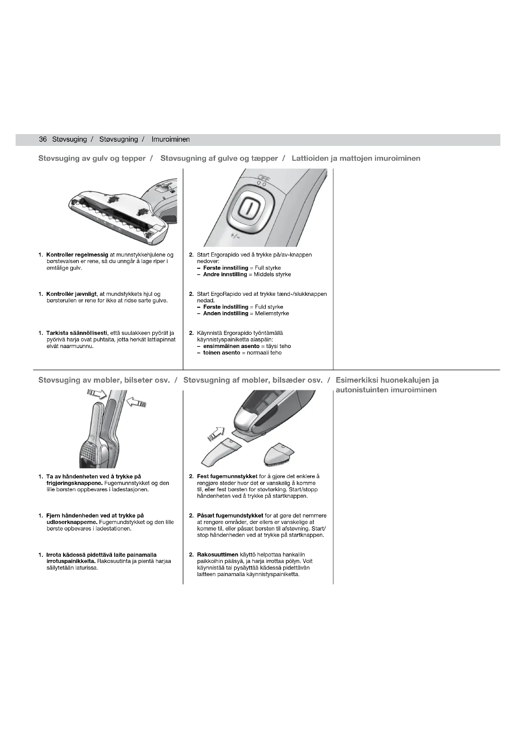 at rengøre områder, der ellers er vanskelige at komme til, eller påsæt børsten til afstøvning. Start/ stop håndenheden ved at trykke på startknappen.