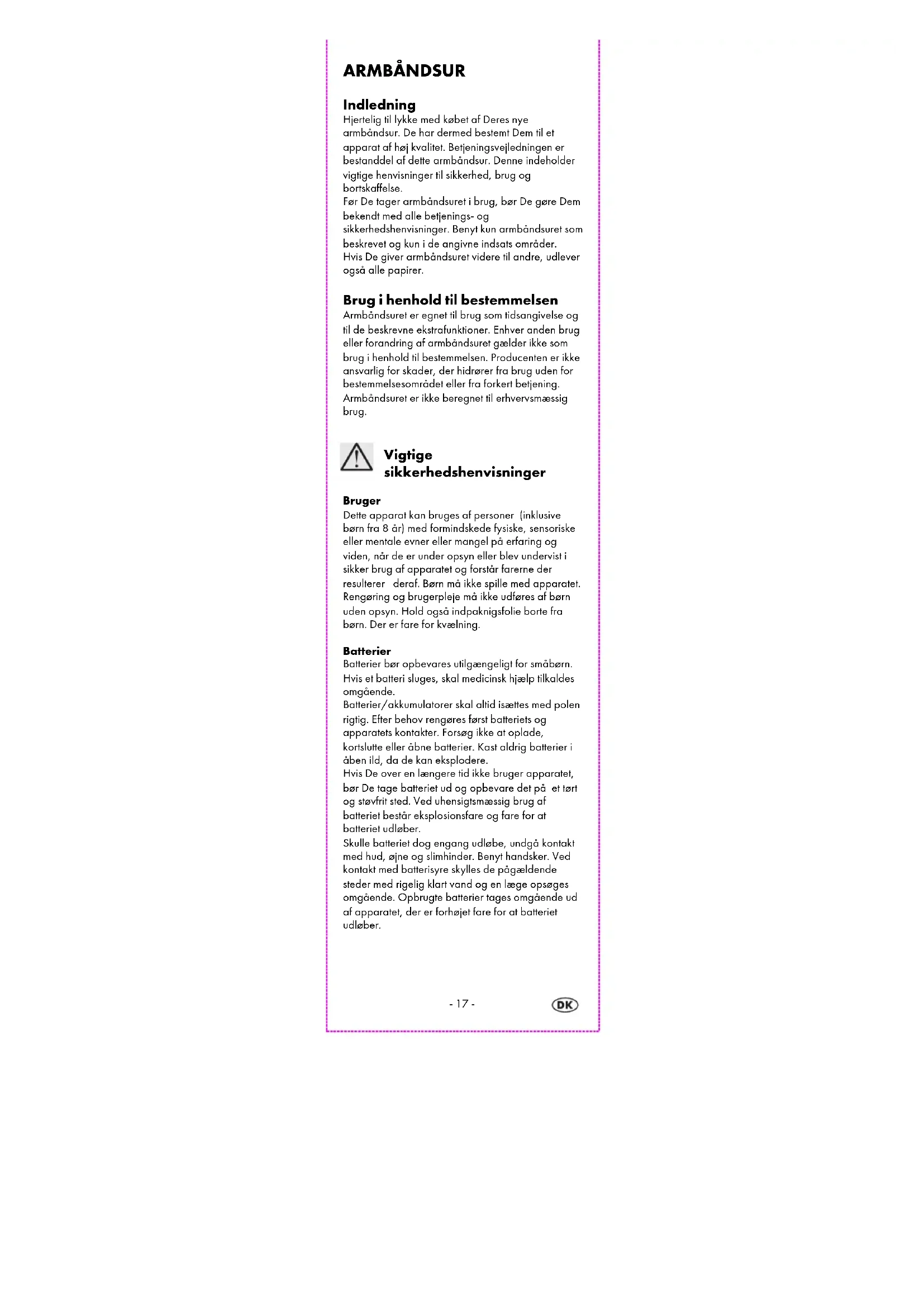 ARMBÅNDSUR Indledning Hjertelig til lykke med købet af Deres nye armbåndsur. De har dermed bestemt Dem til et apparat af høj kvalitet. Betjeningsvejledningen er bestanddel af dette armbåndsur. Denne indeholder vigtige henvisninger til sikkerhed, brug og bortskaffelse. Før De tager armbåndsuret i brug, bør De gøre Dem bekendt med alle betjenings- og sikkerhedshenvisninger. Benyt kun armbåndsuret som beskrevet og kun i de angivne indsats områder. Hvis De giver armbåndsuret videre til andre, udlever også alle papirer. Brug i henhold til bestemmelsen Armbåndsuret er egnet til brug som tidsangivelse og til de beskrevne ekstrafunktioner. Enhver anden brug eller forandring af armbåndsuret gælder ikke som brug i henhold til bestemmelsen. Producenten er ikke ansvarlig for skader, der hidrører fra brug uden for bestemmelsesområdet eller fra forkert betjening. Armbåndsuret er ikke beregnet til erhvervsmæssig brug.