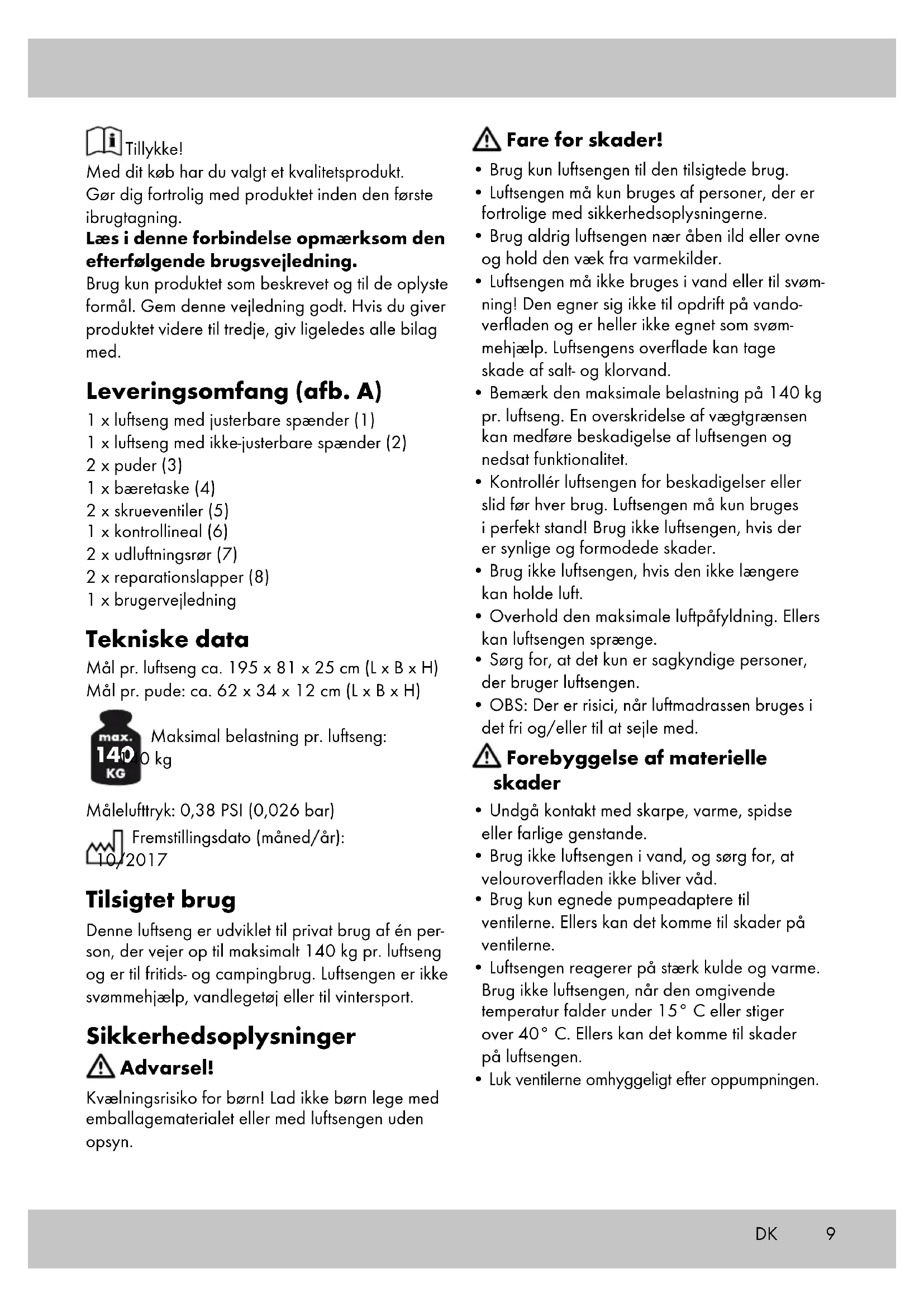 Overhold den maksimale luftpafyldning. Ellers kan luftsen gen sprenge. - Sørg for, at det kun er sagkyndige personer, der bruger luftsengen.